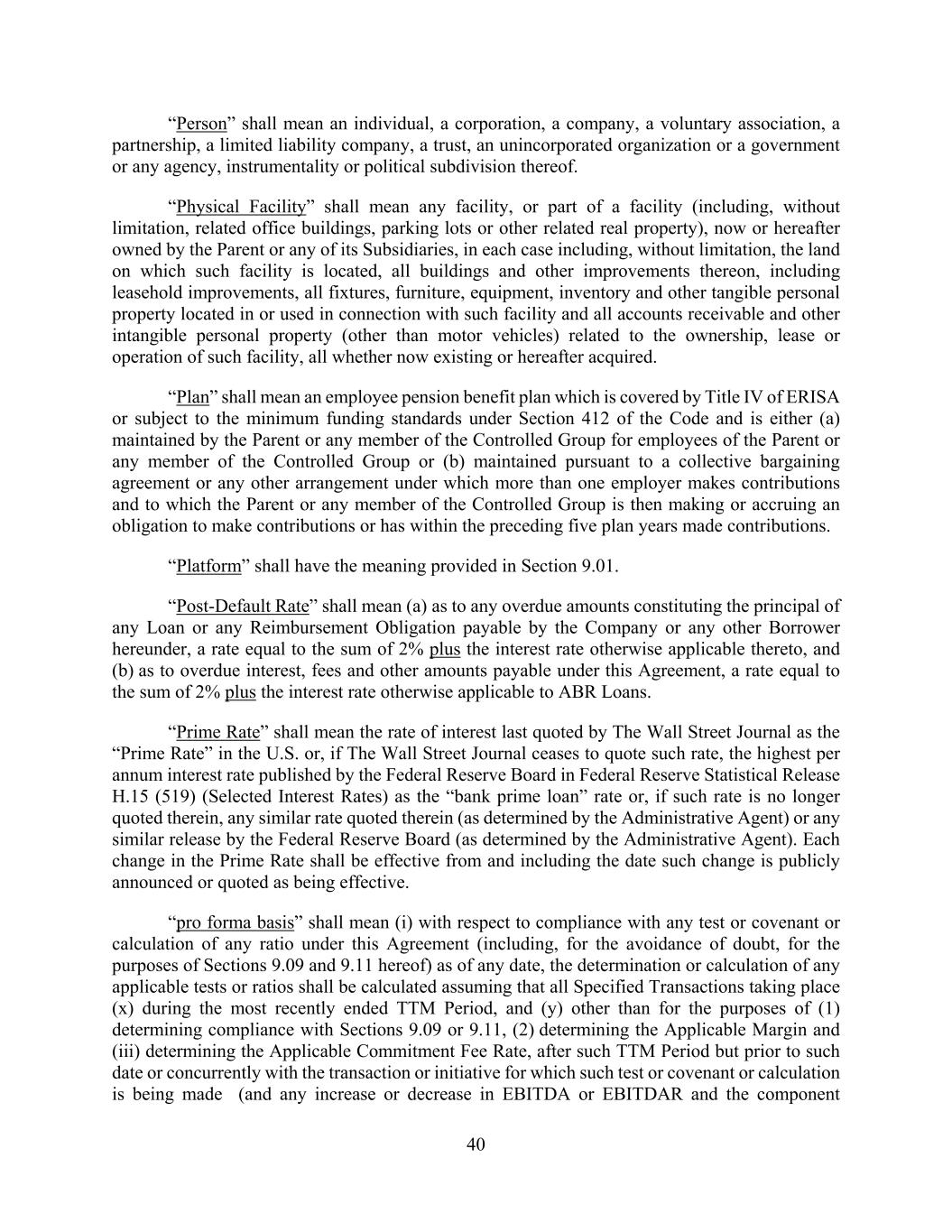 40“人”是指个人、公司、公司、自愿协会、合伙企业、有限责任公司、信托、非法人组织或政府或其任何机构、工具或政治分支机构。“有形设施”系指母公司或其任何子公司现在或以后拥有的任何设施,或设施的一部分(包括但不限于相关办公楼、停车场或其他相关不动产),在每种情况下,包括但不限于该设施所在的土地、所有建筑物及其上的其他改良,包括租赁物改良、位于该设施内或与该设施有关使用的所有固定装置、家具、设备、库存和其他有形个人财产以及与所有权相关的所有应收账款和其他无形个人财产(机动车辆除外),此类设施的租赁或运营,无论是现在存在的还是以后获得的。“计划”是指雇员养老金福利计划,该计划由ERISA标题IV涵盖或受《守则》第412条规定的最低资金标准约束,并且(a)由母公司或受控集团的任何成员为母公司的雇员或受控集团的任何成员维持,或(b)根据集体谈判协议或由一个以上雇主供款的任何其他安排维持以及母公司或受控集团的任何成员当时正在作出或累积作出供款的义务或已在前五个计划年度内作出供款。“平台”应具有第9.01条规定的含义。“违约后利率”是指(a)对于构成公司或任何其他借款人根据本协议应付的任何贷款或任何偿还义务的本金的任何逾期金额,利率等于2%的总和加上其他适用的利率,以及(b)对于根据本协议应付的逾期利息、费用和其他金额,利率等于2%的总和加上ABR贷款其他适用的利率。“最优惠利率”是指最后被《华尔街日报》引用为美国“最优惠利率”的利率,或者,如果《华尔街日报》停止引用该利率,则由美国联邦储备委员会在《联邦储备统计公报》H.15(519)(选定利率)中公布的最高年利率作为“银行最优惠贷款”利率,或者,如果其中不再引用该利率,则由其中引用的任何类似利率(由行政代理人确定)或由联邦储备委员会发布的任何类似利率(由行政代理人确定)。最优惠利率的每项变动均应自该等变动被公开宣布或引述为有效之日起生效,包括该日。“备考基础”系指(i)就截至任何日期根据本协议遵守任何测试或契诺或计算任何比率(包括,为免生疑问,就本协议第9.09及9.11条而言)而言,任何适用测试或比率的确定或计算,须假设在最近结束的TTM期间(x)发生的所有指明交易,及(y)(为(1)确定遵守第9.09或9.11条的目的除外,(2)确定适用的保证金和(iii)确定适用的承诺费率,在该TTM期间之后但在该日期之前或与正在进行该测试、契约或计算的交易或倡议同时(以及EBITDA或EBITDAR的任何增加或减少以及该部分