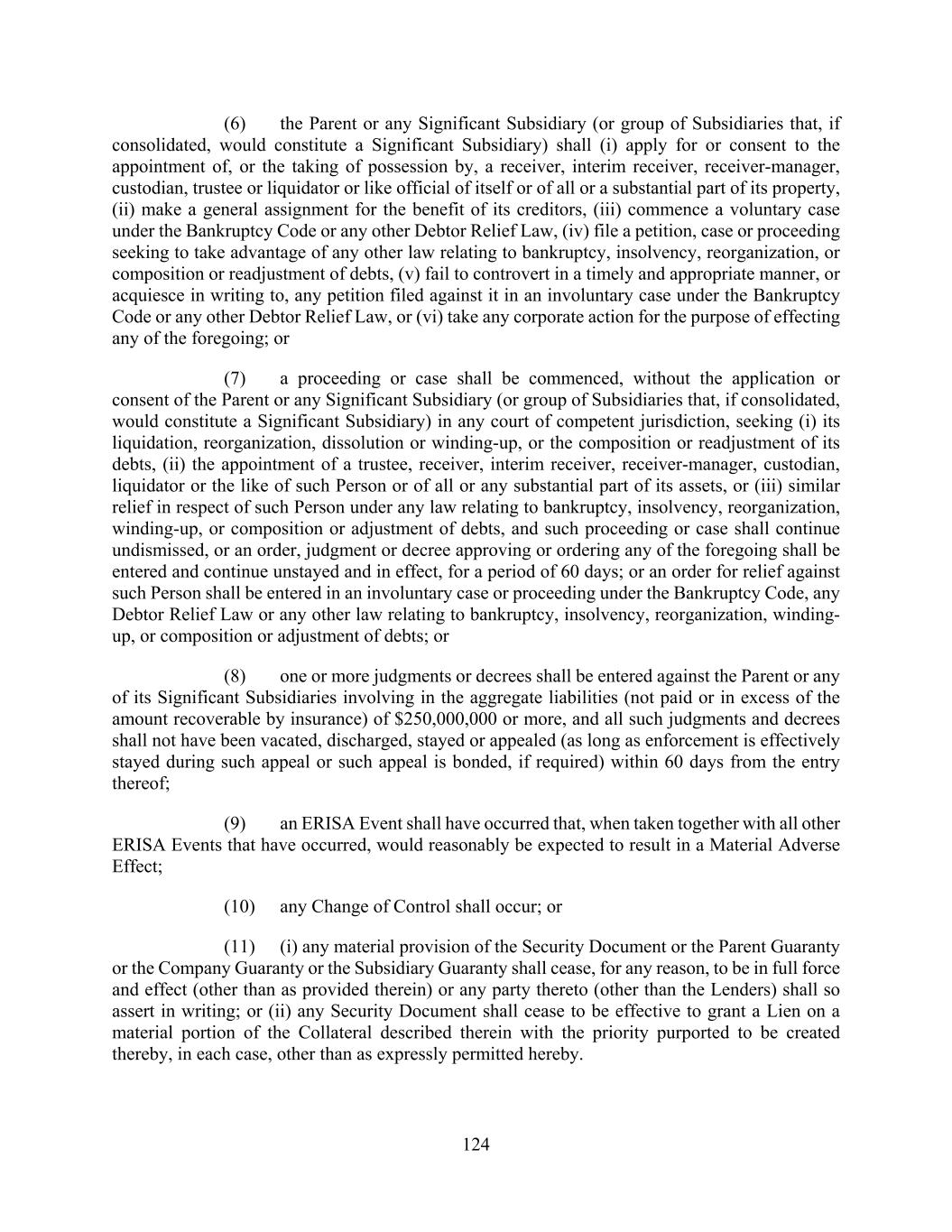 124(6)母公司或任何重要附属公司(或一组附属公司,如果合并,将构成重要附属公司)应(i)申请或同意接管人、临时接管人、接管人-管理人、托管人、受托人或清盘人或类似官员对其本身或其全部或大部分财产的指定或占有,(ii)为其债权人的利益进行一般转让,(iii)根据《破产法》或任何其他债务人救济法启动自愿案件,(iv)提交呈请,寻求利用与破产、无力偿债、重组或债务的组成或重新调整有关的任何其他法律的案件或程序,(v)未能及时和适当地对根据《破产法》或任何其他债务人救济法在非自愿案件中针对其提出的任何呈请提出异议或书面默许,或(vi)为实现上述任何目的而采取任何公司行动;或(7)应启动程序或案件,而无需母公司或任何重要子公司(或子公司集团,如果合并,将构成重要附属公司)在任何有管辖权的法院,寻求(i)其清算、重组、解散或清盘,或其债务的组成或重新调整,(ii)委任该等人或其全部或任何实质部分资产的受托人、接管人、临时接管人、接管人-管理人、保管人、清盘人或类似人员,或(iii)根据与破产、无力偿债、重组、清盘或债务的组成或调整有关的任何法律就该等人作出的类似救济,而该等程序或案件应继续进行而不被驳回,或作出命令,批准或命令上述任何一项的判决或判令,应进入并继续不受限制且有效,为期60天;或根据《破产法》、任何《债务人救济法》或与破产、无力偿债、重组、清盘有关的任何其他法律,在非自愿案件或程序中进入针对该人的救济令,或债务的组成或调整;或(8)应针对母公司或其任何重要子公司作出一项或多项判决或法令,涉及250,000,000美元或以上的总负债(未支付或超过可通过保险追回的金额),且所有该等判决和法令不得在进入后60天内被撤销、解除、中止或上诉(只要在该上诉期间有效中止执行或该上诉被保税,如有要求);(9)应已发生ERISA事件,当与已发生的所有其他ERISA事件一起考虑时,将合理地预期会导致重大不利影响;(10)控制权发生任何变更;或(11)(i)担保文件或母公司担保或公司担保或附属担保的任何重大规定应因任何原因而终止,(ii)任何担保文件对其中所述担保物的重要部分授予留置权的效力(其中规定的除外)或其任何一方(放款人除外)须以书面如此主张;或(ii)在每种情况下,除特此明确许可的情况外,任何担保文件均不再有效,以授予对其中所述担保物的重要部分的留置权,并声称由此设定的优先权。