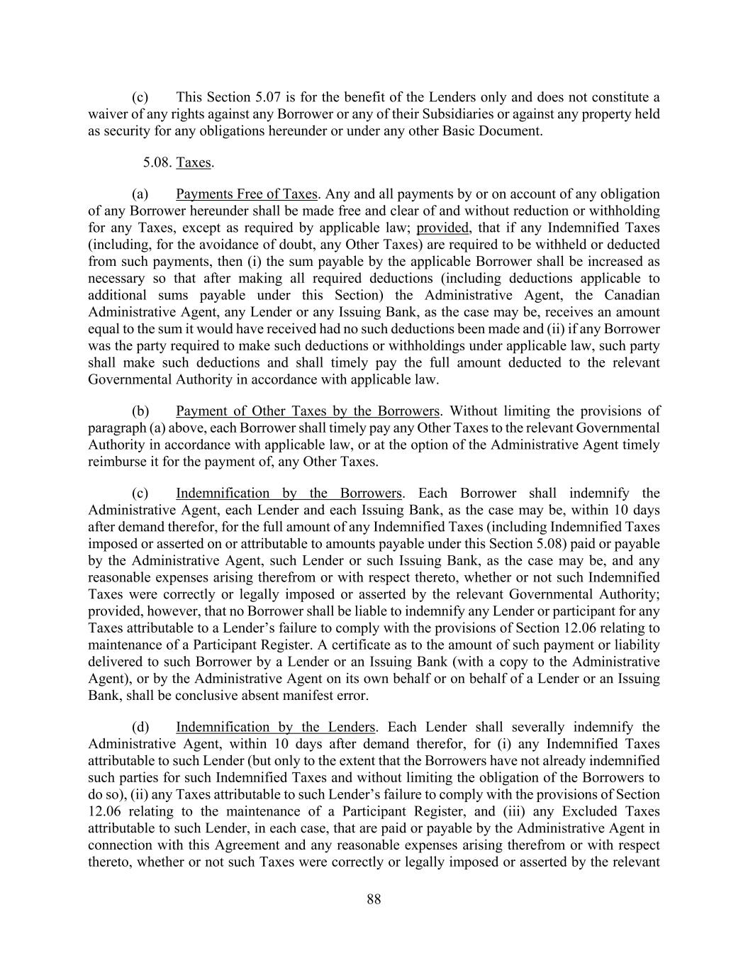 88(c)本条5.07仅为贷款人的利益而设,并不构成放弃针对任何借款人或其任何附属公司的任何权利,或针对作为根据本协议或根据任何其他基本文件承担的任何义务的担保而持有的任何财产的任何权利。5.08.税。(a)免税支付。任何借款人根据本协议承担的任何义务所支付的任何和所有款项,除适用法律规定的情况外,均应免除和清除任何税款,不得减免或扣缴任何税款;但如任何已获赔偿的税款(为免生疑问,包括任何其他税款)须从该等款项中扣缴或扣除,则(i)适用的借款人应支付的款项须视需要增加,以便在作出所有规定的扣除(包括适用于根据本条应支付的额外款项的扣除)后,行政代理人,加拿大行政代理人、任何贷款人或任何开证银行(视情况而定)收到的金额相当于如果没有进行此类扣除就会收到的金额,并且(ii)如果任何借款人是根据适用法律被要求进行此类扣除或预扣的一方,则该一方应进行此类扣除,并应根据适用法律及时向相关政府当局支付全额扣除的金额。(b)借款人缴纳其他税款。在不限制上述(a)款规定的情况下,每一借款人应根据适用法律及时向有关政府主管部门缴纳任何其他税款,或由行政代理人选择及时偿还其缴纳的任何其他税款。(c)借款人的赔偿。各借款人须在要求后10天内,就行政代理人、该贷款人或该开证银行(视属何情况而定)已支付或应付的任何获弥偿税款(包括就根据本条第5.08条须支付的款项征收或主张的或可归属于该等款项的获弥偿税款),以及由此产生或与此有关的任何合理开支,向行政代理人、各贷款人及各开证银行(视属何情况而定)作出弥偿,不论有关政府当局是否正确或合法地征收或主张该等获弥偿税款;但条件是,任何借款人均无法律责任赔偿任何贷款人或参与者因贷款人未能遵守第12.06条有关维持参与者名册的规定而应占的任何税款。由贷款人或开证行(附一份副本给行政代理人),或由行政代理人代表其本人或代表贷款人或开证行交付给该借款人的有关该等付款或负债金额的证明,无明显错误即为结论性证明。(d)贷款人的赔偿。每名贷款人须在要求后10天内,就(i)可归属于该贷款人的任何获弥偿税款(但仅限于借款人尚未就该等获弥偿税款向该等当事人作出弥偿且不限制借款人这样做的义务),(ii)可归属于该贷款人未能遵守第12.06条有关维持参与者名册的规定的任何税款,以及(iii)可归属于该贷款人的任何不包括的税款,在每种情况下,由行政代理人支付或应付的与本协议有关的费用,以及由此产生或与之相关的任何合理费用,无论有关人员是否正确或合法地征收或主张此类税款
