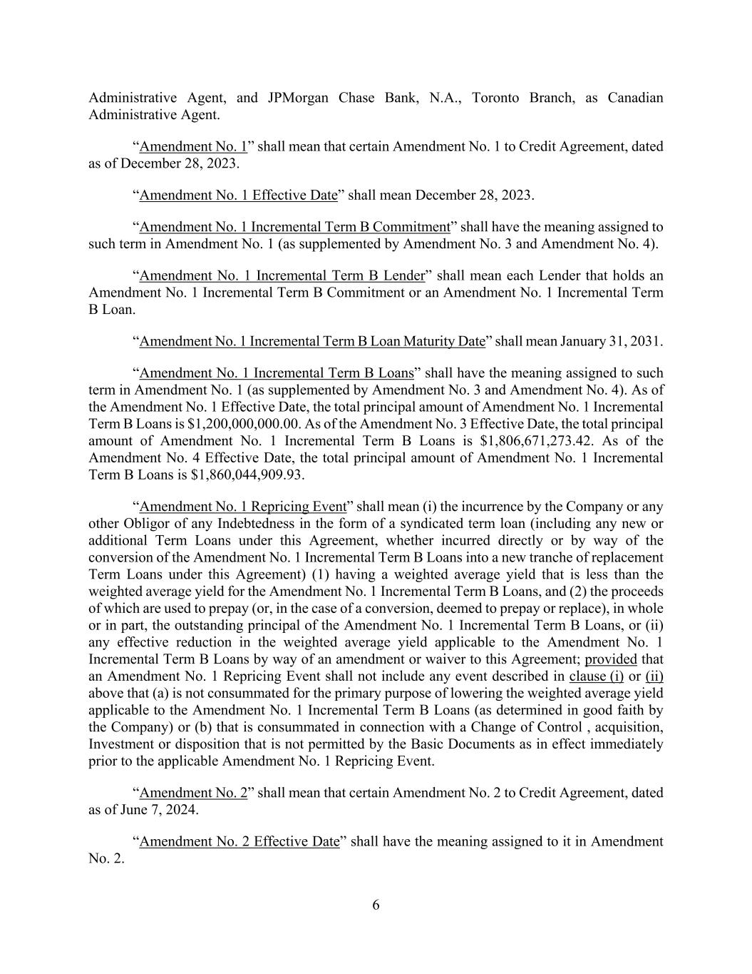 6名行政代理人,并由摩根大通银行,N.A.,多伦多分行担任加拿大行政代理人。“第1号修正案”是指信贷协议的某些第1号修正案,日期为2023年12月28日。“第1号修正案生效日”是指2023年12月28日。“修正1号增量条款B承诺”应具有修正1号(由修正3号和修正4号补充)赋予该词的含义。“修正一号增量期B出借人”是指持有修正一号增量期B承诺或修正一号增量期B贷款的各出借人。“修正1号增量期B贷款到期日”是指2031年1月31日。“修正1号增量期B贷款”应具有修正1号(由修正3号和修正4号补充)赋予该词的含义。截至第1号修正案生效日期,第1号修正案增量定期B贷款的本金总额为1,200,000,000.00美元。截至第3号修正案生效日期,第1号修正案增量定期B贷款的本金总额为1,806,671,273.42美元。截至第4号修正案生效日期,第1号修正案增量定期B贷款的本金总额为1,860,044,909.93美元。“修订第1号重定价事件”是指(i)公司或任何其他债务人以银团定期贷款形式产生的任何债务(包括本协议项下的任何新的或额外的定期贷款,无论是否直接或通过将修订第1号增量B期贷款转换为本协议项下的新一批置换定期贷款的方式产生)(1)加权平均收益率低于修订第1号增量B期贷款的加权平均收益率,(2)其所得款项用于全部或部分预付(或在转换的情况下,视为预付或替换)修订第1号增量B期贷款的未偿还本金,或(ii)以对本协议作出修订或豁免的方式,有效降低适用于修订第1号增量期B贷款的加权平均收益率;但修订第1号重新定价事件不应包括上文(i)或(ii)条所述的任何事件,即(a)并非以降低适用于修订第1号增量期B贷款(由公司善意确定)或(b)的加权平均收益率为主要目的而完成的任何与控制权变更、收购、在紧接适用的第1号修订重新定价事件之前生效的基本文件不允许的投资或处置。“第2号修正案”是指对信贷协议的某些第2号修正案,日期为2024年6月7日。“第2号修正案生效日”具有第2号修正案赋予的含义。