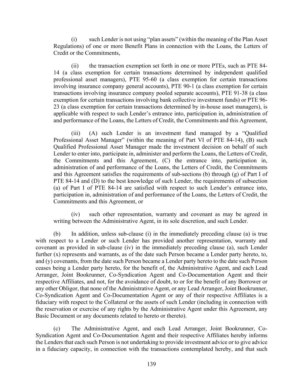 139(i)该等贷款人未就贷款、信用证或承诺使用一项或多项利益计划的“计划资产”(在《计划资产条例》的含义内),(ii)一项或多项PTE中规定的交易豁免,例如PTE 84-14(由独立的合格专业资产管理人确定的某些交易的类别豁免)、PTE 95-60(涉及保险公司一般账户的某些交易的类别豁免)、PTE 90-1(涉及保险公司集合独立账户的某些交易的类别豁免),PTE 91-38(涉及银行集体投资基金的某些交易的类别豁免)或PTE 96-23(由内部资产管理人确定的某些交易的类别豁免),适用于该等贷款人进入、参与、管理和履行贷款、信用证、承诺和本协议,(iii)(a)该等贷款人是由“合格的专业资产管理人”(在TERM84-14第VI部分的含义内)管理的投资基金,(b)该合格的专业资产管理人代表该贷款人作出投资决定,以订立、参与,管理和履行贷款、信用证、承诺和本协议,(c)贷款、信用证、承诺和本协议的进入、参与、管理和履行满足PTE 84-14第I部的(b)至(g)小节的要求,以及(d)据该贷款人所知,该贷款人就该贷款人进入、参与、管理和履行贷款、信用证、承诺和本协议而言,符合TERM84-14第I部的(a)小节的要求,或(iv)行政代理人全权酌情与该贷款人以书面协定的其他陈述、保证及契诺。(b)此外,除非(a)项中的第(i)款就放款人而言是真实的,或该放款人已按(a)项中的第(iv)款的规定提供另一项陈述、保证和契诺,否则该放款人进一步(x)表示并保证,自该人成为本协议的放款方之日起至(y)契诺,自该人成为本协议的放款方之日起至该人不再是本协议的放款方之日止,为行政代理人及各牵头安排人、联席账簿管理人的利益,共同银团代理及共同单证代理及其各自的附属公司,而为免生疑问,不为任何借款人或任何其他义务人或其利益,行政代理人或任何牵头安排人、联席账簿管理人、共同银团代理及共同单证代理或其各自的任何附属公司均不是该贷款人的抵押品或资产的受托人(包括与行政代理人根据本协议、任何基本文件或与本协议或其相关的任何文件的保留或行使任何权利有关)。(c)行政代理人、各牵头安排人、联席账簿管理人、共同银团代理人及共同文件代理人及其各自的关联公司特此通知贷款人,各该等人不承诺就特此设想的交易提供投资建议或以受托人身份提供建议,且该等