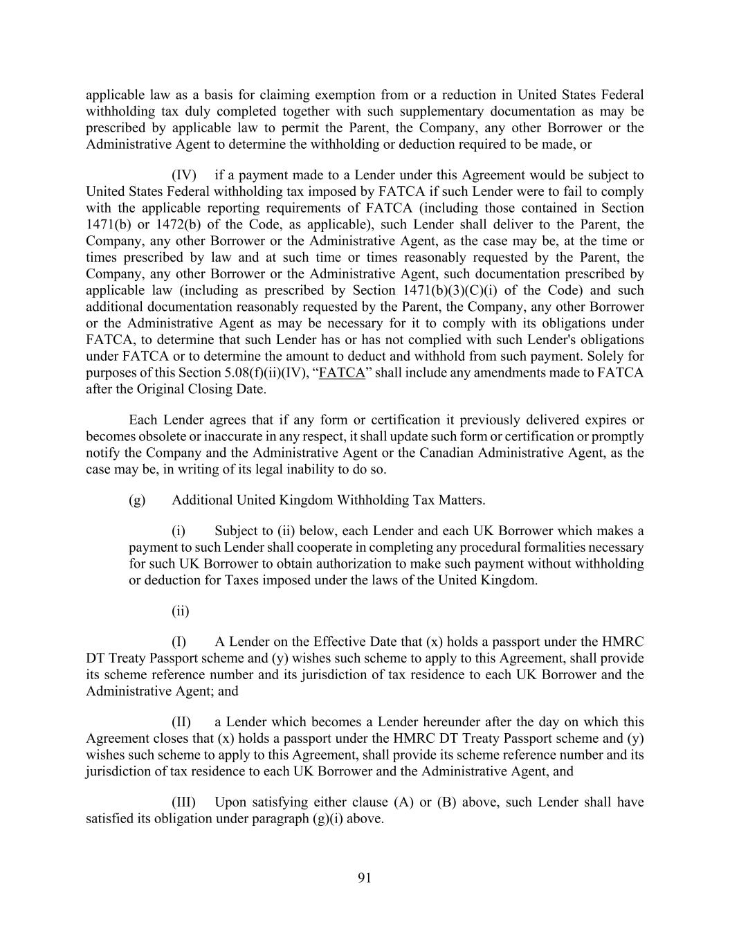 91适用法律作为申请豁免或减少美国联邦预扣税的依据,连同适用法律可能规定的补充文件,以允许母公司、公司、任何其他借款人或行政代理人确定所需的预扣或扣除,或(IV)如根据本协议向贷款人支付的款项如该贷款人未能遵守FATCA的适用报告要求(包括适用的《守则》第1471(b)或1472(b)节所载的要求),将须缴纳FATCA征收的美国联邦预扣税,则该贷款人应在法律规定的时间和母公司、公司合理要求的时间向母公司、公司、任何其他借款人或行政代理人(视情况而定)交付,任何其他借款人或行政代理人、适用法律(包括《守则》第1471(b)(3)(C)(i)条规定的)规定的文件以及母公司、公司、任何其他借款人或行政代理人为遵守其在FATCA下的义务而可能需要的其他合理要求的额外文件,以确定该贷款人已经或没有遵守该贷款人在FATCA下的义务,或确定从该等付款中扣除和扣留的金额。仅为本节5.08(f)(二)(四)的目的,“FATCA”应包括在原始截止日期之后对FATCA所做的任何修订。各贷款人同意,如果其先前交付的任何表格或证明在任何方面过期或过时或不准确,其应更新该表格或证明,或迅速以书面形式通知公司和行政代理人或加拿大行政代理人(视情况而定)其在法律上无法这样做。(g)额外的英国预扣税事项。(i)除下文第(ii)款另有规定外,每名贷款人及每名向该贷款人付款的英国借款人,均须合作完成任何必要的程序手续,以使该英国借款人获得授权支付该款项,而无须扣缴或扣除根据英国法律征收的税款。(ii)(i)在生效日期(x)持有HMRC DT条约护照计划下的护照且(y)希望该计划适用于本协议的贷款人,应向每一英国借款人和行政代理人提供其计划参考编号及其税务居住地的管辖权;(ii)在本协议结束之日后成为本协议下的贷款人的贷款人(x)持有HMRC DT条约护照计划下的护照且(y)希望该计划适用于本协议,应向每个英国借款人和行政代理人提供其计划参考编号和其税务居住地的管辖权,并且(III)在满足上述(A)或(B)条款中的任何一条时,该贷款人应已履行其根据上述(g)(i)段承担的义务。
