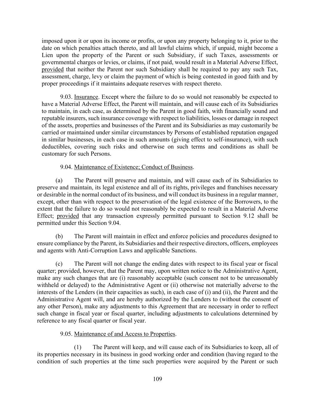 109在附加罚款的日期之前对其或其收入或利润,或对属于其的任何财产,以及所有合法债权,如果未支付,可能成为对母公司或该子公司的财产的留置权,如果此类税款、评估或政府收费或征费,或债权,如果未支付,将导致重大不利影响,但不得要求母公司或该子公司支付任何此类税款、评估、收费,如果就此保持足够的准备金,则出于善意和通过适当的程序对其付款进行征税或索赔。9.03.保险。除非未能这样做不会合理地预期会产生重大不利影响,否则母公司将维持,并将促使其每个子公司在每种情况下与财务稳健和信誉良好的保险人维持有关母公司及其子公司的资产、财产和业务的责任、损失或损害的保险范围,这些保险范围通常可能由从事类似业务的已确立声誉的人员在类似情况下承担或维持,在每种情况下,金额(使自我保险生效)、免赔额、涵盖风险或以其他方式按这些人的习惯条款和条件。9.04.维持存在;开展业务。(a)母公司将维护和维持,并将促使其每个子公司维护和维持其合法存在及其在正常开展业务时所必需或可取的所有权利、特权和特许经营权,并将以正常方式开展业务,但与维护借款人的合法存在有关的除外,在不这样做不会合理地预期会导致重大不利影响的范围内;但根据第9.12条明确允许的任何交易应根据本条第9.04条获得允许。(b)母公司将保持有效并执行旨在确保母公司、其子公司及其各自的董事、高级职员、雇员和代理人遵守反腐败法和适用制裁的政策和程序。(c)母公司不会更改其财政年度或财政季度的结束日期;但条件是,母公司可在向行政代理人发出书面通知后,作出(i)行政代理人可合理接受的任何此类更改(该同意不得被无理拒绝或延迟)或(ii)在其他方面不会对贷款人(以其身份)的利益产生重大不利影响的任何此类更改,在(i)和(ii)的每一情况下,母公司和行政代理人将,并特此获贷款人授权(无需任何其他人同意)对本协议进行必要的调整,以反映财政年度或财政季度的此类变化,包括对参照任何财政季度或财政年度确定的计算进行调整。9.05.维护和访问物业。(1)母公司将保持,并将促使其各附属公司保持其业务所需的所有财产处于良好的工作状态和状况(已考虑到该等财产在母公司收购该等财产时的状况或