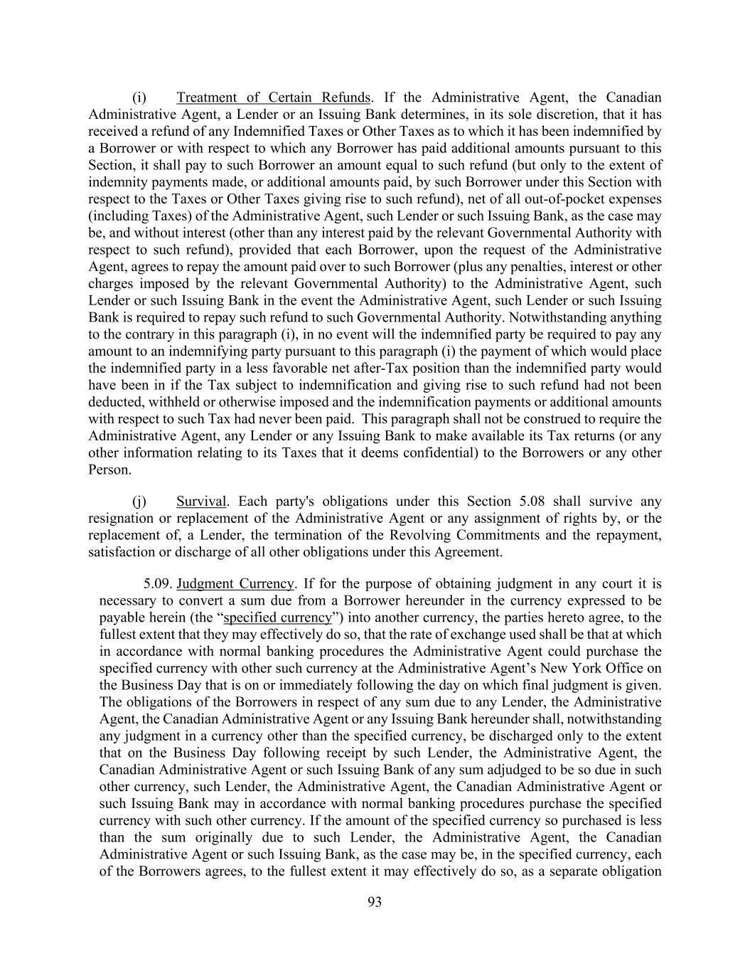 93(i)某些退款的处理。如行政代理人、加拿大行政代理人、贷款人或开证银行全权酌情决定,其已收到由借款人赔偿的任何补偿税款或其他税款的退款,或任何借款人已根据本条支付额外款项,则其应向该借款人支付与该退款相等的金额(但仅限于已支付的赔偿款项或已支付的额外款项,由该等借款人根据本条就产生该等退款的税款或其他税款),扣除行政代理人、该贷款人或该发行银行(视属何情况而定)的所有自付费用(包括税款),且不计利息(有关政府当局就该等退款所支付的任何利息除外),但条件是每名借款人应行政代理人的要求,同意向该行政代理人偿还已支付予该借款人的款项(加上有关政府当局施加的任何罚款、利息或其他费用),该等贷款人或该等开证行在行政代理人、该等贷款人或该等开证行被要求向该政府当局偿还该等退款的情况下。尽管本款(i)项另有相反规定,在任何情况下,均不会要求受弥偿方根据本款(i)项向受弥偿方支付任何款项,而支付该款项将使受弥偿方处于比受弥偿方所处的税后净状况更不利的情况,如果应予赔偿并引起此种退款的税款没有被扣除、扣缴或以其他方式征收,并且从未支付与此种税款有关的赔偿款项或额外款项。本款不得解释为要求行政代理人、任何贷款人或任何开证银行向借款人或任何其他人提供其纳税申报表(或其认为保密的与其税收有关的任何其他信息)。(j)生存。每一方在本条第5.08款下的义务应在行政代理人的任何辞职或更换或贷款人的任何权利转让或更换、循环承诺的终止以及本协议项下所有其他义务的偿还、清偿或解除后继续有效。5.09.判断货币。如果为了在任何法院获得判决的目的,需要将本协议项下借款人应支付的款项以本协议中表示应支付的货币(“指定货币”)转换为另一种货币,则本协议各方同意,在他们可以有效这样做的最大范围内,使用的汇率应为行政代理人按照正常银行程序可以在作出最终判决当日或紧接其后的营业日在行政代理人纽约办事处购买指定货币与其他此类货币的汇率。借款人就任何贷款人、行政代理人、加拿大行政代理人或本协议项下任何开证银行所欠的任何款项所承担的义务,即使有任何以指明货币以外的货币作出的判决,亦只须在该贷款人、行政代理人、加拿大行政代理人或该开证银行收到以该其他货币、该贷款人、该行政代理人经裁定如此到期的任何款项后的营业日解除,加拿大行政代理人或该等开证行可按照正常银行业务程序以该等其他货币购买指定货币。如果如此购买的指定货币的金额少于最初应支付给该贷款人的金额,则行政代理人、加拿大行政代理人或该发行银行(视情况而定)以指定货币计算,各借款人同意,在其可能有效这样做的最大范围内,作为一项单独的义务