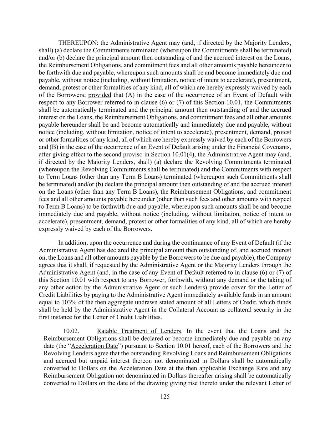 125然后:行政代理人可以(并且,如果受到多数贷款人的指示,应)(a)宣布承诺终止(据此,承诺应予终止)和/或(b)宣布当时未偿还的贷款本金和应计利息、偿还义务、承诺费和根据本协议应付的所有其他金额立即到期应付,因此这些金额应立即到期应付,而无需通知(包括但不限于意向加速通知)、出示、要求、抗议或其他任何形式的手续,所有这些均由各借款人在此明确放弃;但(a)在发生本第10.01条第(6)或(7)款所述任何借款人的违约事件的情况下,承诺应自动终止,并且当时未偿还的贷款本金和应计利息、偿还义务、承诺费以及根据本协议应付的所有其他金额应自动和立即到期应付,而无需通知(包括但不限于加速的意向通知)、提示、要求,抗议或其他任何形式的手续,所有这些均由各借款方特此明确放弃,以及(b)在发生根据财务契诺产生的违约事件的情况下,在第10.01(4)条第二项但书生效后,行政代理人可(并在多数贷款人指示的情况下,应)(a)宣布循环承诺终止(据此循环承诺应予终止)和与定期贷款(任何B期贷款除外)有关的承诺终止(据此此类承诺应予终止)和/或(b)宣布当时未偿还的本金金额和贷款(任何B期贷款除外)的应计利息、偿还义务、承诺费和根据本协议应付的所有其他金额(此类费用和与B期贷款有关的其他金额除外)立即到期应付,据此这些金额应且立即到期应付,无通知(包括但不限于加速意向通知)、提示、要求、抗议或其他任何形式的手续,所有这些均由各借款人在此明确表示放弃。此外,在任何违约事件发生时及持续期间(如行政代理人已宣布当时未偿还的贷款本金及借款人须支付的所有其他款项的应计利息到期应付),公司同意,如行政代理人或多数贷款人透过行政代理人提出要求(以及,如发生本第10.01条第(6)或(7)款所提述的与任何借款人有关的任何违约事件,随即,在没有任何要求或行政代理人或此类贷款人采取任何其他行动的情况下)通过向行政代理人支付金额等于所有信用证当时未提取声明总额的103%的即时可用资金的方式为信用证负债提供担保,这些资金应由行政代理人在抵押品账户中作为信用证负债的一审抵押担保而持有。10.02.贷款人的可评定待遇。如果贷款和偿还义务应根据本协议第10.01条在任何日期(“加速日期”)宣布或立即到期应付,各借款人及循环贷款人同意,未偿还的循环贷款和偿还债务以及未以美元计值的应计但未支付的利息应在加速日期按当时适用的汇率自动转换为美元,其后产生的任何未以美元计值的偿还债务应在根据相关信函产生的提款日自动转换为美元