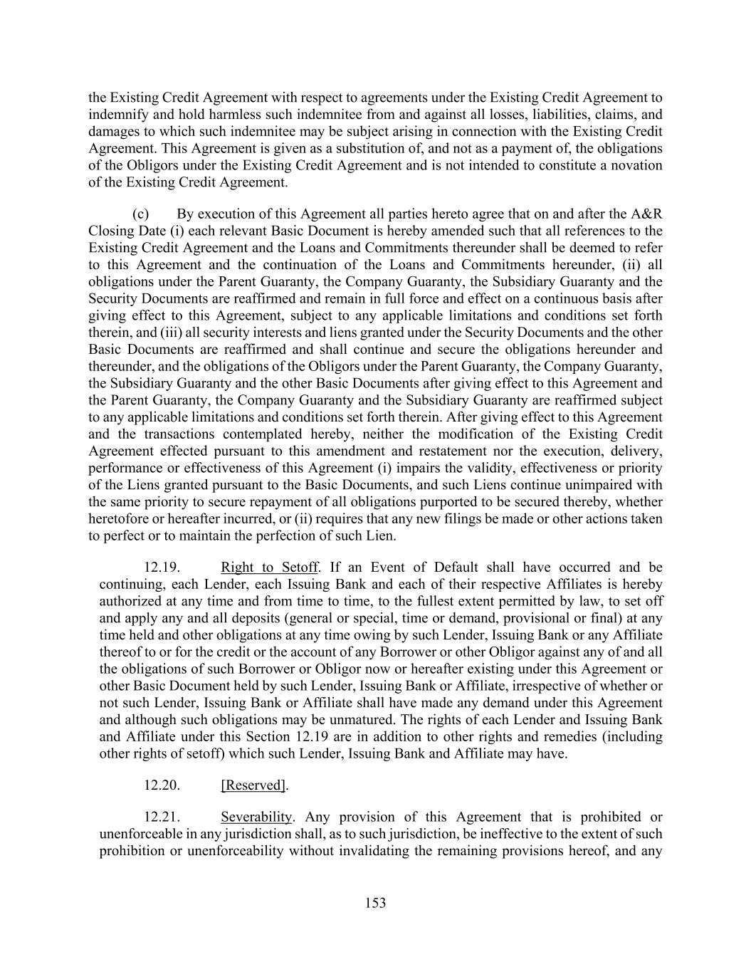153现有信贷协议有关现有信贷协议项下的协议,以就该等受偿人可能因与现有信贷协议有关而产生的所有损失、责任、索赔和损害向该等受偿人作出赔偿并使其免受损害。本协议作为替代而非支付现有信贷协议项下义务人的义务而给予,并不旨在构成现有信贷协议的更新。(c)通过执行本协议,本协议所有各方同意,在A & R截止日期及之后(i)每一份相关基本文件特此修订,以便所有提及现有信贷协议及其项下的贷款和承诺均应被视为提及本协议以及本协议项下的贷款和承诺的延续,(ii)母公司担保、公司担保、附属担保和担保文件项下的所有义务均得到重申,并在本协议生效后在持续的基础上保持完全有效,受其中规定的任何适用限制和条件的约束,以及(iii)根据担保文件和其他基本文件授予的所有担保权益和留置权得到重申,并应延续和担保本协议及其项下的义务,以及在本协议和母公司担保生效后,在母担保、公司担保、附属担保和其他基本文件项下的义务人的义务、公司担保和附属担保得到重申,但受其中规定的任何适用限制和条件的约束。在本协议和本协议所设想的交易生效后,根据本修订和重述进行的对现有信贷协议的修改以及本协议的执行、交付、履行或有效性(i)均不会损害根据基本文件授予的留置权的有效性、有效性或优先权,并且此类留置权继续不受损害,具有相同的优先权,以确保偿付所有据称由其担保的债务,无论是在此之前还是在此之后发生,或(ii)要求作出任何新的申报或采取其他行动以完善或维持该留置权的完善。12.19.抵销权。如违约事件已发生且仍在继续,兹授权各贷款人、各发行银行及其各自的关联机构在法律允许的最大范围内随时并不时抵销和适用该贷款人在任何时间持有的任何和所有存款(一般或特别、时间或活期、临时或最终)以及在任何时间所欠的其他债务,发行银行或其任何关联机构向或为任何借款人或其他债务人的信贷或账户针对该借款人或债务人现在或以后根据本协议或该贷款人、发行银行或关联机构持有的其他基本文件所存在的任何和所有义务,无论该贷款人、发行银行或关联机构是否已根据本协议提出任何要求,尽管该等义务可能未到期。每个贷款人和发行银行及关联公司根据本条第12.19款享有的权利,是这些贷款人、发行银行和关联公司可能拥有的其他权利和补救措施(包括其他抵消权)的补充。12.20.[保留]。12.21.可分割性。本协议中任何在任何司法管辖区被禁止或不可执行的条款,就该司法管辖区而言,在不使本协议其余条款无效的情况下,在该禁止或不可执行的范围内,以及任何