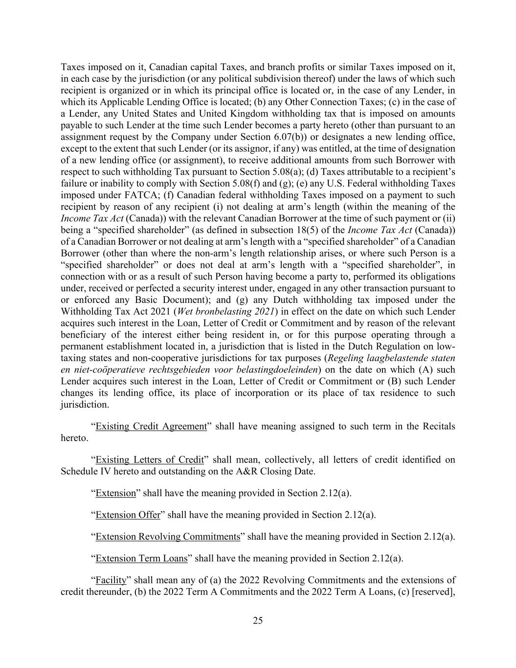 25对其征收的税款、加拿大资本税、分支机构利润或类似税款,在每种情况下均由组织此类收款人或其主要办事处所在的法律规定的司法管辖区(或其任何政治分支机构)征收,或就任何贷款人而言,其适用的贷款办事处所在的法律规定;(b)任何其他连接税;(c)就贷款人而言,在该贷款人成为本协议的一方时(根据公司根据第6.07(b)节提出的转让请求)或指定新的贷款办事处时,对应付给该贷款人的金额征收的任何美国和英国预扣税,除非该贷款人(或其转让人,如果有的话)在指定新的贷款办事处(或转让)时有权,根据第5.08(a)节从该借款人收取与此种预扣税款有关的额外款项;(d)因收款人未遵守或无法遵守第5.08(f)节而产生的税款(g);(e)根据FATCA征收的任何美国联邦预扣税;(f)由于任何收款人(i)在付款时未与相关加拿大借款人进行公平交易(在《所得税法》(加拿大)的含义内)或(ii)是加拿大借款人的“特定股东”(定义见《所得税法》(加拿大)第18(5)款)或未与加拿大借款人的“特定股东”进行公平交易(非公平交易关系产生的情况除外,或如果该人是“特定股东”或未与“特定股东”进行公平交易,则与或由于该人已成为一方当事人、履行其在一项担保权益下的义务、收到或完善其在一项担保权益下的义务、根据或强制执行任何基本文件从事任何其他交易有关);(g)根据该贷款人获得贷款中的此类权益之日生效的《2021年预扣税法》(Wet bronbelasting 2021)征收的任何荷兰预扣税,信用证或承诺书以及由于该权益的相关受益人居住在或为此目的通过位于被列入《荷兰低税收州条例》和为税收目的的非合作司法管辖区(Regeling laagbelastende staten en niet-co ö peratieve rechtsgebieden voor belastingdoeleinden)的司法管辖区(a)该贷款人在贷款、信用证或承诺中获得该权益之日或(b)该贷款人将其贷款办事处、其注册地或其税务居住地变更为该司法管辖区。“现有信贷协议”应在本协议的陈述中具有赋予该术语的含义。“现有信用证”统称为在本协议附表IV中确定并在A & R截止日期未结清的所有信用证。“延期”应具有第2.12(a)节规定的含义。“延期要约”应具有第2.12(a)节规定的含义。“延期循环承诺”应具有第2.12(a)节规定的含义。“展期定期贷款”应具有第2.12(a)节规定的含义。“融资”是指(a)2022年循环承诺及其项下的信贷展期,(b)2022年A期承诺和2022年A期贷款,(c)[保留],