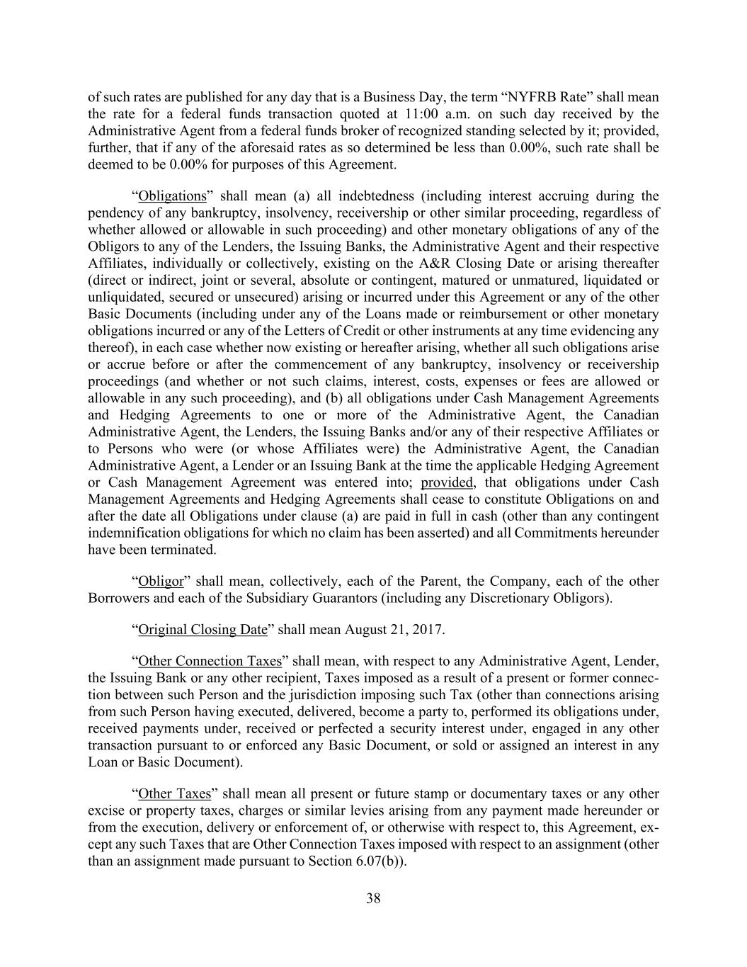 上述利率中的38项公布日期为营业日的任何一天,“NYFRB利率”一词系指行政代理人从其选定的具有公认地位的联邦基金经纪商处收到的在该日上午11:00报价的联邦基金交易利率;此外,如果如此确定的上述利率中的任何一项低于0.00个百分点,则就本协议而言,该利率应被视为0.00个百分点。“债务”是指(a)任何债务人对任何贷款人、开证银行、行政代理人及其各自的关联公司单独或集体、在A & R截止日存在或其后产生的所有债务(包括在任何破产、无力偿债、接管或其他类似程序未决期间产生的利息,无论该等程序是否允许或允许)和其他货币债务(直接或间接、共同或若干、绝对或或有、已到期或未到期、已清算或未清算,有担保或无担保)根据本协议或任何其他基本文件(包括根据作出的任何贷款或偿还或发生的其他货币义务或任何证明其任何时间的任何信用证或其他票据)产生或招致的,在每种情况下,无论是现在存在的还是以后产生的,所有此类义务是否在任何破产、无力偿债或接管程序启动之前或之后产生或产生(以及在任何此类程序中是否允许或允许此类债权、利息、成本、费用或费用),(b)根据现金管理协议和套期保值协议对行政代理人、加拿大行政代理人、贷款人、发行银行和/或其各自的任何关联公司中的一名或多名或在订立适用的套期保值协议或现金管理协议时曾是(或其关联公司曾是)行政代理人、加拿大行政代理人、贷款人或发行银行的人承担的所有义务;但前提是,现金管理协议和套期保值协议项下的义务应在(a)条项下的所有义务以现金全额支付(未主张索赔的任何或有赔偿义务除外)且本协议项下的所有承诺已终止之日及之后终止构成义务。“债务人”是指母公司、公司、其他各借款方及附属公司各担保人(包括任何全权债务人)的合称。“原始截止日期”是指2017年8月21日。“其他关连税”是指,就任何行政代理人、贷款人、开证行或任何其他收款人而言,由于该人与征收该税款的司法管辖区之间存在或曾经的联系而征收的税款(但因该人已签署、交付、成为一方当事人、履行其在该项下的义务、根据该项下收取付款、收到或完善该项下的担保权益、根据或强制执行任何基本文件从事任何其他交易、或出售或转让任何贷款或基本文件的权益而产生的关联除外)。“其他税项”系指因根据本协议支付的任何款项或因执行、交付或强制执行本协议或以其他方式与本协议有关而产生的所有当前或未来的印花税或跟单税款或任何其他消费税或财产税、收费或类似征费,不包括就转让(根据第6.07(b)节作出的转让除外)征收的任何此类税款。