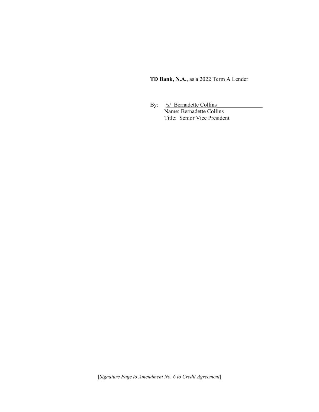 【信贷协议第6号修正案签署页】TD Bank,N.A.,作为2022年期限的贷款人:/s/Bernadette Collins ______________姓名:Bernadette Collins职务:高级副总裁
