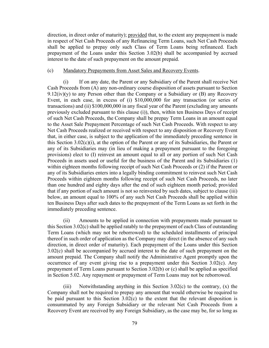 79方向,按直接到期顺序排列);但前提是,在就任何再融资定期贷款的净现金收益进行任何提前还款的范围内,此类净现金收益应仅用于提前偿还正在再融资的该类定期贷款。根据本条第3.02(b)款提前偿还贷款的每笔款项,均须附有截至预付款项之日的应计利息。(c)资产出售和追回事件的强制性预付款项。(i)如果在任何日期,母公司或母公司的任何子公司应从(a)根据第9.12(iv)(y)条向公司或子公司以外的任何人进行的任何非正常过程资产处置或(b)任何追偿事件中获得净现金收益,在每种情况下,超过(i)任何交易(或一系列交易)的10,000,000美元和(ii)母公司任何财政年度的100,000,000美元(不包括先前根据本第(i)条排除的任何金额),则在收到该等净现金收益后十个营业日内,公司应提前偿还定期贷款,金额等于该等现金净收益的资产出售提前还款百分比。就任何处置或追回事件实现或收到的任何现金收益净额而言,在任何一种情况下,均须由母公司或其任何子公司选择适用本条第3.02(c)(i)款中的前一句,母公司或其任何子公司可(而不是根据上述规定进行预付款)选择(i)(1)在收到该等现金净收益后的十八个月内,或(2)如果母公司或其任何子公司在收到该等现金净收益后的十八个月内订立具有法律约束力的承诺,将该等现金净收益再投资,不迟于该十八个月期间结束后的一百八十天;但如该等金额的任何部分在该等日期前未如此再投资,则在符合下文第(iii)条的规定下,须在该等日期后十个营业日内适用相当于任何该等现金所得款项净额100%的金额,以提前偿还上一句所述的定期贷款。(ii)就依据本条第3.02(c)条作出的预付款项而须适用的款额,须按公司指示的申请顺序(在没有任何该等指示的情况下,按直接到期顺序)按比例适用于每类未偿还定期贷款(不得再借出)的本金预定分期的预付。根据本条第3.02(c)款提前偿还贷款的每笔款项,均须附有截至预付款项之日的应计利息。公司应在发生任何引起根据本条第3.02(c)款预付款项的事件时立即通知行政代理人。任何依据第3.02(b)或(c)条提前偿还定期贷款,须按第5.02条所指明适用。任何偿还或提前偿还定期贷款不得再借。(iii)尽管本条第3.02(c)条另有相反规定,(x)只要有关处分由任何外国附属公司完成或任何外国附属公司(视属何情况而定)收到追讨事件的有关现金净收益,公司无须预付依据本条第3.02(c)条原本须支付的任何款额,只要