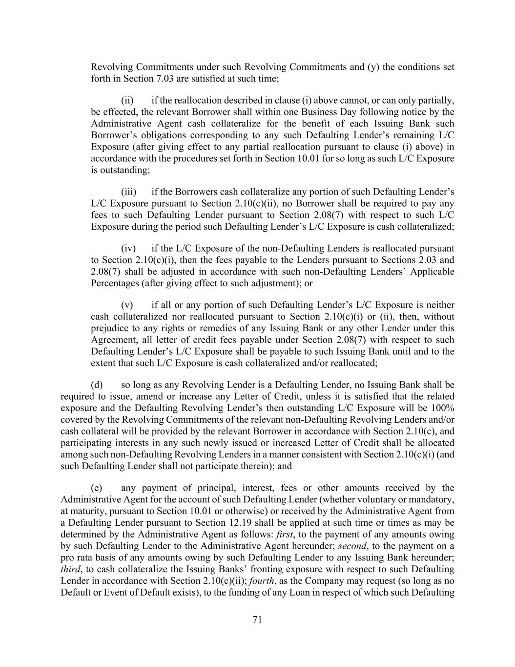 71根据此类循环承诺和(y)第7.03节规定的条件在此时得到满足的循环承诺;(ii)如果上述第(i)款所述的重新分配不能或只能部分实现,相关借款人应在行政代理人发出通知后的一个营业日内,按照第10.01条规定的程序(在根据上文第(i)款实施任何部分重新分配后)为各开证银行的利益以现金抵押该借款人与任何该等违约贷款人的剩余信用证风险敞口(只要该等信用证风险敞口尚未清偿)所对应的义务;(iii)如果借款人根据第2.10(c)(ii)条以现金抵押该违约贷款人的信用证风险敞口的任何部分,任何借款人均无须根据第2.08(7)条就该等信用证风险在该违约贷款人的信用证风险以现金作抵押期间向该违约贷款人支付任何费用;(iv)如非违约贷款人的信用证风险根据第2.10(c)(i)条重新分配,则根据第2.03及2.08(7)条应付予放款人的费用,须根据该等非违约放款人的适用百分比(在作出该等调整后)作出调整;或(v)如该等违约放款人的信用证风险的全部或任何部分既非根据第2.10(c)(i)或(ii)条作现金抵押或重新分配,则在不损害任何开证银行或任何其他放款人根据本协议所享有的任何权利或补救办法的情况下,根据第2.08(7)条就该违约贷款人的信用证风险敞口应支付的所有信用证费用应支付给该开证银行,直至并在该信用证风险敞口以现金抵押和/或重新分配的范围内;(d)只要任何循环贷款人是违约贷款人,则无需开证银行签发、修改或增加任何信用证,除非信纳相关风险敞口及违约循环贷款人当时未偿还的信用证风险敞口将由相关非违约循环贷款人的循环承诺100%覆盖和/或现金抵押品将由相关借款人根据第2.10(c)节提供,且任何该等新发行或增加的信用证的参与权益应以符合第2.10(c)(i)节的方式在该等非违约循环贷款人之间分配(且该违约贷款人不得参与其中);及(e)任何本金、利息的支付,行政代理人为该违约贷款人的账户收取的费用或其他款项(不论是自愿或强制性的、到期时、根据第10.01条或其他方式),或行政代理人根据第12.19条从违约贷款人收取的费用或其他款项,应在行政代理人可能确定的以下时间或时间适用:第一,用于支付该违约贷款人根据本协议欠该行政代理人的任何款项;第二,按比例支付该违约贷款人根据本协议欠任何开证行的任何款项;第三,根据第2.10(c)(ii)节以现金抵押开证行对该违约贷款人的正面风险敞口;第四,根据公司可能要求(只要不存在违约或违约事件),为该违约所涉及的任何贷款提供资金
