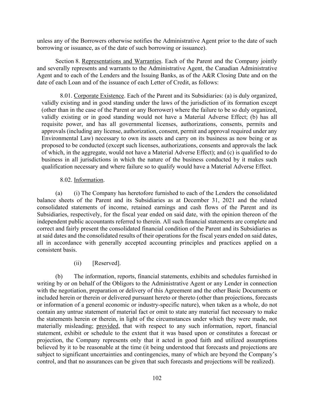 102除非任何借款人在该借款或发行日期之前另行通知行政代理人,截至该借款或发行日期)。第8节。申述及保证。母公司和公司各自于A & R截止日及每笔贷款和每笔信用证签发之日向行政代理人、加拿大行政代理人及各贷款人和开证银行共同和分别作出声明和保证,具体如下:8.01。公司存在。各母公司及其子公司:(a)根据其成立的司法管辖区的法律已适当组织、有效存在且具有良好信誉,但(母公司或任何借款人除外)未能如此适当组织、有效存在或具有良好信誉不会产生重大不利影响;(b)拥有所有必要的权力,并拥有所有政府许可、授权、同意、许可和批准(包括任何许可、授权、同意,根据任何环境法所需的许可和批准)拥有其资产并按目前或拟进行的方式开展其业务所需的许可和批准(此类许可、授权、同意和批准除外,如果缺乏这些许可、授权、同意和批准,总体上不会产生重大不利影响);(c)有资格在其所开展的业务的性质使此类资格成为必要的所有法域开展业务,如果不这样做将产生重大不利影响。8.02.信息。(a)(i)公司迄今已分别向各贷款人提供截至2021年12月31日的母公司及其附属公司的综合资产负债表,以及母公司及其附属公司截至该日期止财政年度的相关综合收益、留存收益及现金流量表,并附有其中所指独立公共会计师的意见。所有该等财务报表均完整无误,并公允地呈列于上述日期的母公司及其附属公司的综合财务状况及其于上述日期结束的财政年度的综合经营业绩,所有这些均符合在一致基础上适用的公认会计原则和惯例。(二)[保留]。(b)由义务人或代表义务人就本协议及其他基本文件的谈判、编制或交付以书面形式向行政代理人或任何贷款人提供的或包含在本协议或其中或依据本协议或其交付的信息、报告、财务报表、展品和附表(一般经济或行业特定性质的预测、预测或信息除外),作为一个整体,不包含任何不真实的重大事实陈述或遗漏陈述作出本协议或其中陈述所必需的任何重大事实,鉴于作出这些预测的情况,不具有重大误导性;但就任何该等资料、报告、财务报表、展品或附表而言,只要其是基于或构成预测或预测,公司仅表示其本着诚意行事并利用其当时认为合理的假设(据了解,预测和预测受到重大不确定性和或有事项的影响,其中许多超出了公司的控制范围,并且不能保证此类预测和预测将会实现)。
