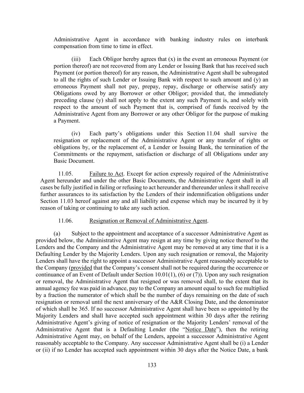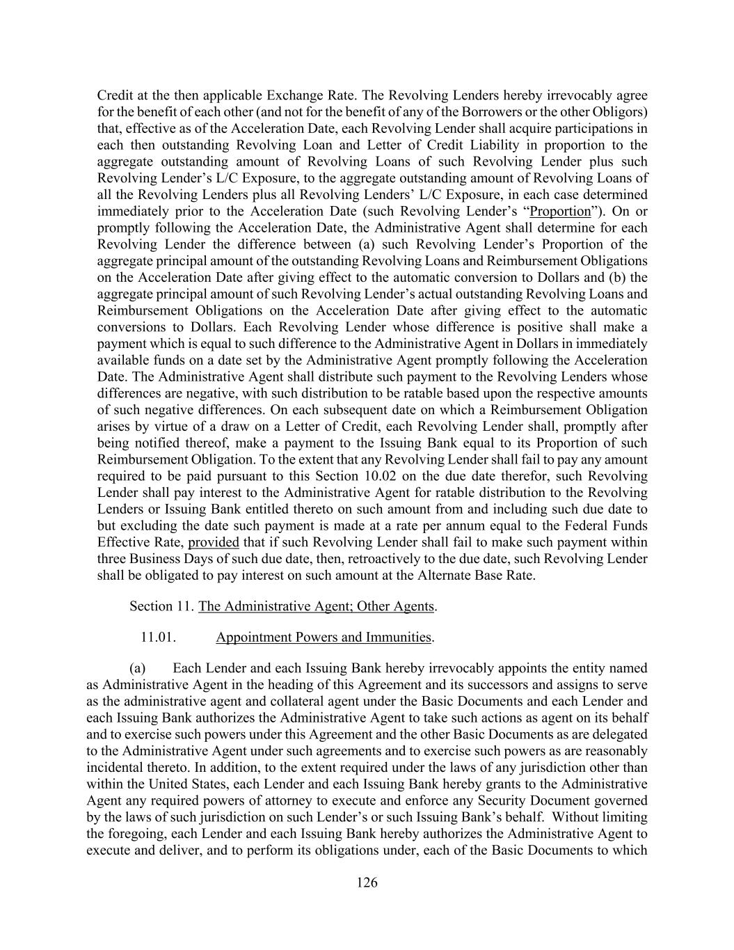 126按当时适用的汇率贷记。循环放款人在此不可撤销地同意,为了彼此的利益(而不是为了任何借款人或其他债务人的利益),自加速日期起,每个循环放款人应按该循环放款人的循环贷款未偿总额加上该循环放款人的信用证风险敞口,与所有循环放款人的循环贷款未偿总额加上所有循环放款人的信用证风险敞口的比例,获得参与每笔当时未偿还的循环贷款和信用证负债,在紧接加速日期之前确定的每种情况下(此类循环贷款人的“比例”)。在加速日期当日或之后立即,行政代理人应为每个循环贷款人确定(a)该循环贷款人在加速日期自动转换为美元生效后未偿还循环贷款和偿还债务的本金总额的比例与(b)该循环贷款人在加速日期自动转换为美元生效后实际未偿还循环贷款和偿还债务的本金总额之间的差额。差额为正的每一循环贷款人应在加速日期之后迅速由行政代理人设定的日期以立即可用的资金向行政代理人支付等于该差额的款项。行政代理人应当将该等款项分配给差额为负的循环贷款人,该等分配应根据该等负差额的各自数额进行评级。在其后因信用证提款而产生偿还义务的每个日期,各循环贷款人应在收到通知后立即向开证银行支付与其该偿还义务比例相等的款项。如任何循环放款人未能在到期日支付根据本条第10.02条规定须支付的任何款项,则该循环放款人应向行政代理人支付利息,以便按比例分配给循环放款人或有权获得该款项的发行银行,利息自(包括)该到期日起至但不包括按相当于联邦基金实际利率的年利率支付该款项之日止,但如果该循环贷款人未能在该到期日的三个营业日内支付该款项,则追溯至到期日,该循环贷款人有义务按备用基准利率支付该金额的利息。第11节。行政代理人;其他代理人。11.01.委任权力及豁免。(a)各贷款人及各开证行在此不可撤销地指定本协议标题中指定为行政代理人的实体及其继承人,并指派其担任基本文件项下的行政代理人及抵押代理人,各贷款人及各开证行授权行政代理人以代理人身份代其采取行动,并行使本协议及其他基本文件项下根据该等协议授予行政代理人的权力,并行使合理附带的权力。此外,在美国境内以外的任何司法管辖区的法律要求的范围内,每个贷款人和每个发行银行特此向行政代理人授予任何必要的授权书,以代表该贷款人或该发行银行执行和执行受该司法管辖区法律管辖的任何担保文件。在不限制前述内容的情况下,各贷款人和各开证行在此授权行政代理人执行和交付、履行其所依据的每一份基本单据所承担的义务