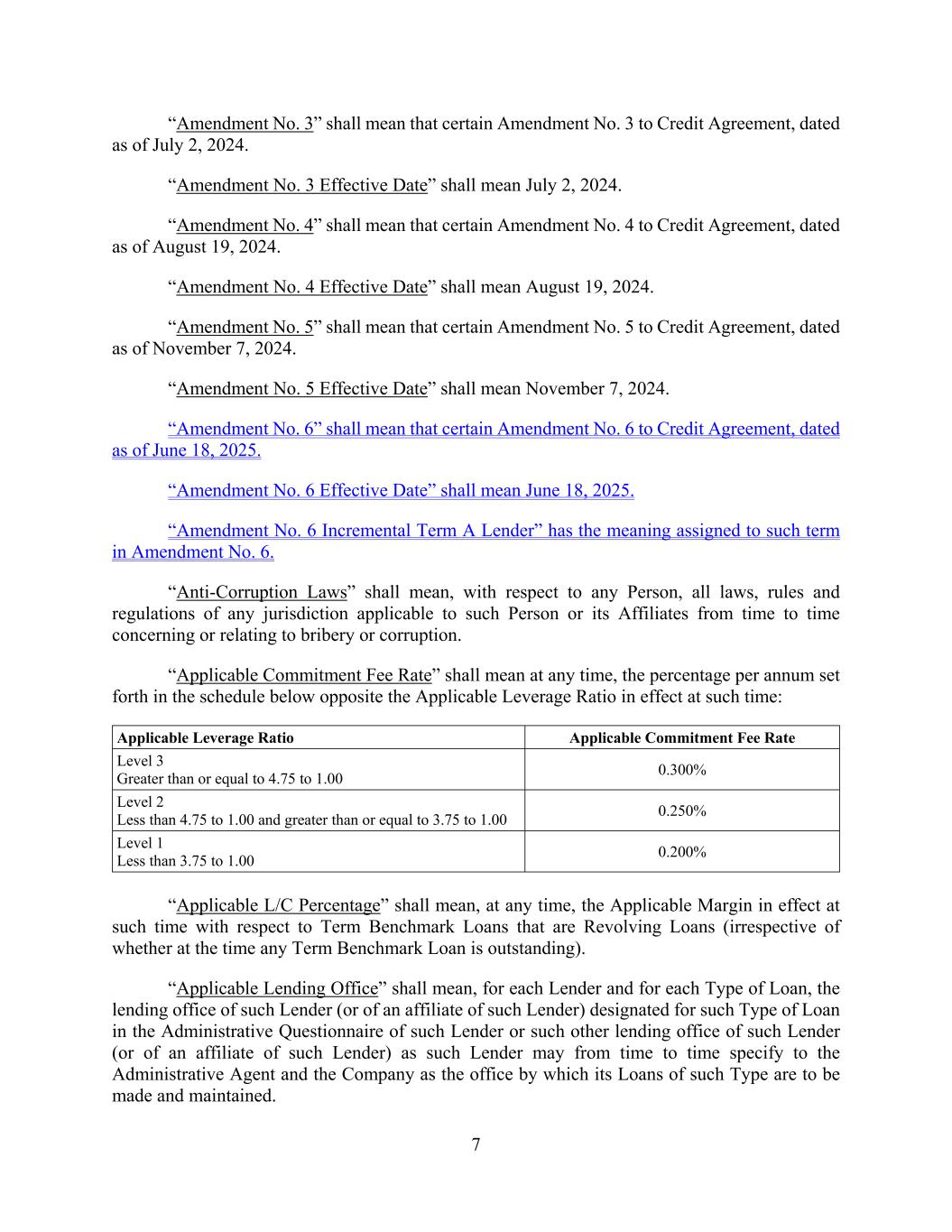 7“第3号修正案”是指对信贷协议的某些第3号修正案,日期为2024年7月2日。“第3号修正案生效日期”是指2024年7月2日。“第4号修正案”是指对信贷协议的某些第4号修正案,日期为2024年8月19日。“第4号修正案生效日期”是指2024年8月19日。“第5号修正案”是指对信贷协议的某些第5号修正案,日期为2024年11月7日。“第5号修正案生效日期”是指2024年11月7日。“第6号修正案”是指对信贷协议的某些第6号修正案,日期为2025年6月18日。“第6号修正案生效日期”是指2025年6月18日。“第6号修正案增量条款贷款人”具有第6号修正案赋予该条款的含义。“反腐败法”就任何人而言,是指任何司法管辖区不时适用于该人或其附属公司的有关或与贿赂或腐败有关的所有法律、规则和条例。“适用承诺费率”是指,在任何时候,与当时有效的适用杠杆率相对的附表所列的年利率百分比:适用杠杆率适用承诺费率等级3大于等于4.75至1.00 0.300%等级2小于4.75至1.00且大于等于3.75至1.00 0.250%等级1小于3.75至1.00 0.200%“适用信用证百分比”是指,在任何时候,对于属于循环贷款的定期基准贷款(无论当时是否有任何定期基准贷款未偿还),此时有效的适用保证金。“适用贷款办公室”是指,就每个贷款人和每一类贷款而言,该贷款人(或该贷款人的关联公司)在该贷款人的行政问卷中指定用于此类贷款的贷款办公室或该贷款人(或该贷款人的关联公司)的其他贷款办公室可能不时向行政代理人和公司指明,作为其此类贷款的发放和维持的办公室。