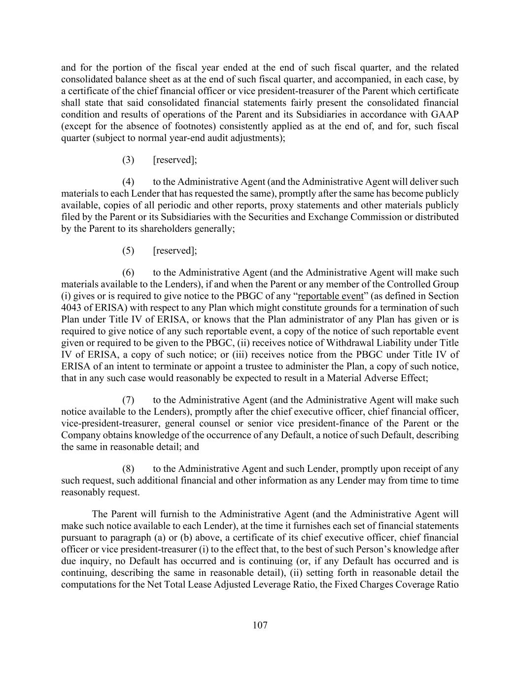 107和在该财政季度末结束的财政年度的部分,以及在该财政季度末的相关合并资产负债表,并在每种情况下均附有一份母公司首席财务官或副总裁兼财务主管的证明,该证明应说明所述合并财务报表根据在该财政季度末一贯适用的公认会计原则(没有脚注的情况除外)公允地反映了母公司及其子公司的合并财务状况和经营业绩,并为,此类财政季度(须按正常年终审计调整);(3)[保留];(4)向行政代理人(且行政代理人将向提出相同要求的每个贷款人交付此类材料),在该材料公开后立即将母公司或其子公司向证券交易委员会公开备案或由母公司一般向其股东分发的所有定期报告和其他报告、代理声明和其他材料的副本;(5)[保留];(6)向行政代理人(由行政代理人向贷款人提供此类材料),如果和当母公司或受控集团(i)的任何成员就任何计划向PBGC发出或被要求向PBGC发出可能构成根据ERISA标题IV终止该计划的理由的任何“可报告事件”(定义见ERISA第4043条)的通知,或知道任何计划的计划管理人已发出或被要求发出任何该等可报告事件的通知时,向PBGC发出或被要求发出该等可报告事件通知的副本,(ii)接获ERISA第四编项下的撤回法律责任通知,该等通知的副本;或(iii)接获PBGC根据ERISA第四编项发出的有意终止或委任受托人以管理该计划的通知,该通知的副本,在任何该等情况下合理地预期会导致重大不利影响;(7)向行政代理人(而行政代理人将向贷款人提供该等通知),在首席执行官、首席财务官、副总裁兼司库,总法律顾问或高级副总裁-母公司或公司的财务获得关于任何违约发生的知情、此类违约的通知,并以合理的详细说明;(8)向行政代理人和此类贷款人,在收到任何此类请求后立即提供任何贷款人可能不时合理要求的额外财务和其他信息。母公司将在根据上述(a)或(b)段提供每套财务报表时,向行政代理人(而行政代理人将向每个贷款人提供此类通知)提供其首席执行官、首席财务官或副总裁兼财务主管(i)的证明,大意是,据该人在经过适当查询后所知,没有发生违约并且仍在继续(或者,如果发生了任何违约并且仍在继续,则以合理的细节描述相同的情况),(ii)合理详细列明净总租赁调整后杠杆率、固定费用覆盖率的计算