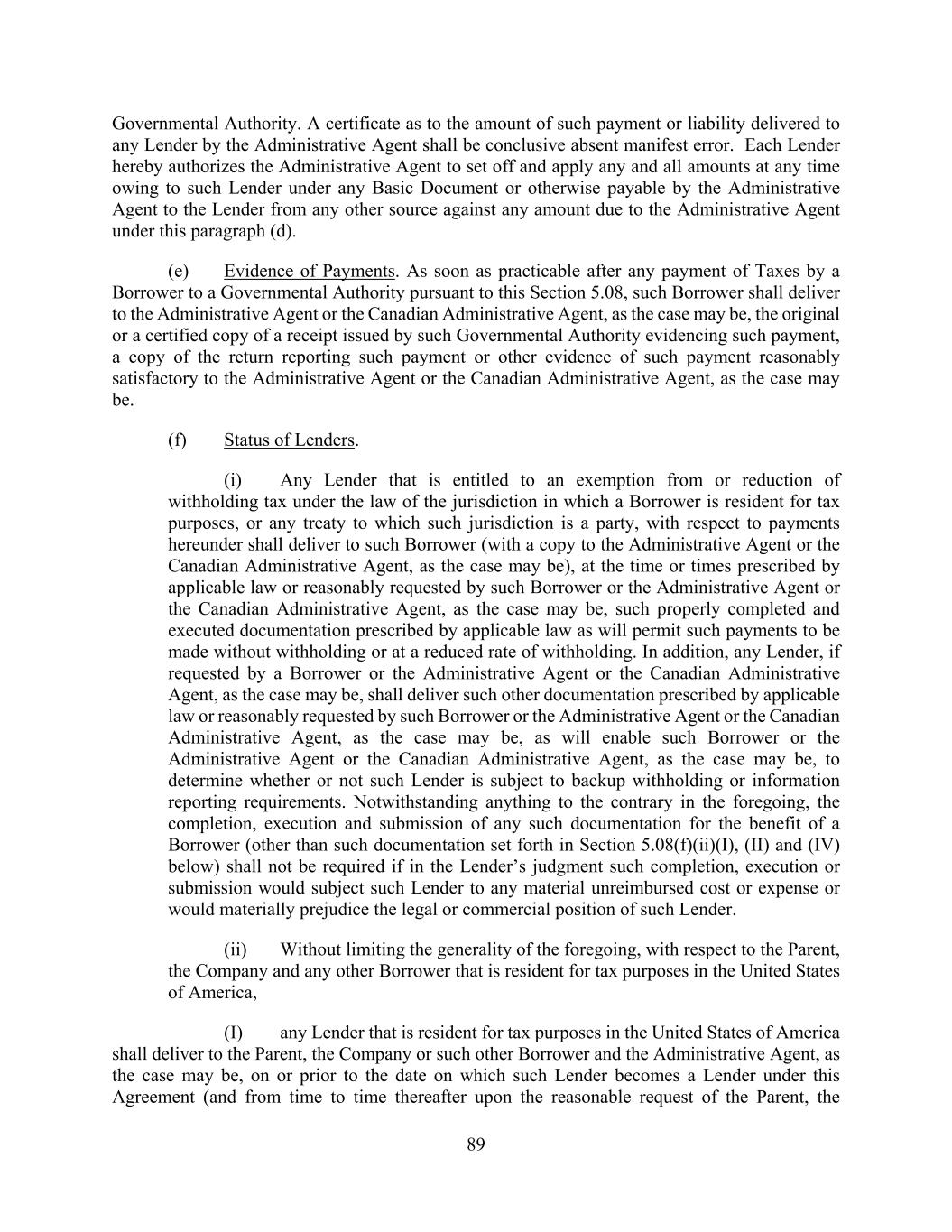 89政府当局。行政代理人交付给任何贷款人的有关该等付款或负债金额的证明,应为无明显错误的结论性证明。各贷款人特此授权行政代理人在任何时间抵销及适用根据任何基本文件欠该贷款人或由行政代理人以其他方式从任何其他来源应付给贷款人的任何及所有款项,抵销根据本款(d)项欠该行政代理人的任何款项。(e)付款证据。在借款人依据本条第5.08条向政府当局缴付税款后,该借款人须在切实可行范围内尽快向行政代理人或加拿大行政代理人(视属何情况而定)交付该政府当局发出的证明该付款的收据的正本或核证副本、报告该付款的申报表副本或行政代理人或加拿大行政代理人(视属何情况而定)合理满意的该付款的其他证据。(f)贷款人的地位。(i)任何贷款人如根据借款人为税务目的而居住的司法管辖区的法律或该司法管辖区为缔约方的任何条约有权就本协议项下的付款获得预扣税款的豁免或减免,应在适用法律规定的时间或该借款人或该行政代理人或该加拿大行政代理人(视情况而定)合理要求的时间或时间向该借款人交付(连同一份副本交付给该行政代理人或该加拿大行政代理人(视情况而定),适用法律规定的适当填写和执行的文件,允许在不预扣或降低预扣率的情况下支付此类款项。此外,任何贷款人如有借款人或行政代理人或加拿大行政代理人(视属何情况而定)的要求,须交付适用法律订明或该借款人或行政代理人或加拿大行政代理人(视属何情况而定)合理要求的其他文件,使该借款人或该行政代理人或加拿大行政代理人(视属何情况而定)能确定该贷款人是否须遵守备用扣缴或资料报告规定。尽管前述有任何相反规定,如果贷款人判断完成、执行或提交任何此类文件将使该贷款人承担任何重大的未偿还成本或费用,或将对该贷款人的法律或商业地位造成重大损害,则不需要为借款人的利益完成、执行和提交任何此类文件(下文第5.08(f)(二)(i)、(二)和(四)节所述此类文件除外)。(ii)在不限制前述一般性的情况下,就母公司、公司及任何其他为税务目的而在美利坚合众国居住的借款人而言,(i)任何为税务目的而在美利坚合众国居住的贷款人,须在该贷款人根据本协议成为贷款人的日期或之前(及其后不时应母公司的合理要求而向该贷款人、公司或该其他借款人及行政代理人(视属何情况而定)交付