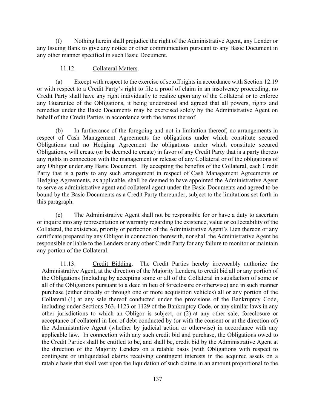 137(f)本条文不损害行政代理人、任何贷款人或任何开证银行依据任何基本文件以该基本文件所指明的任何其他方式发出任何通知或其他通讯的权利。11.12.抵押事项。(a)除根据第12.19条行使抵销权或信用方在破产程序中提交债权证明的权利外,任何信用方均无权单独对任何担保物变现或强制执行对债务的任何担保,但有一项理解并同意,基本单证项下的所有权力、权利和补救办法可仅由行政代理人代表信用方根据其条款行使。(b)为促进而不是限制上述情况,任何与构成担保债务所依据的债务有关的现金管理协议的安排,以及构成担保债务所依据的债务的任何套期保值协议,都不会产生(或被视为产生)有利于作为其一方的任何信用方的任何与任何抵押品的管理或解除或任何基本文件下任何债务人的义务有关的任何权利。通过接受担保物的利益,作为现金管理协议或套期保值协议(如适用)的任何此类安排的一方的每一信用方,应被视为已指定行政代理人担任基本单证项下的行政代理人和担保物代理人,并同意作为基本单证项下的信用方受基本单证约束,但以本款规定的限制为限。(c)行政代理人不负责或有义务查明或查询关于担保物的存在、价值或可收集性、行政代理人对其留置权的存在、优先权或完善性的任何陈述或保证或任何义务人就此而拟备的任何凭证,行政代理人也不对贷款人或任何其他信用方负责或承担责任,也不因未能监测或维持担保物的任何部分。11.13.信用招标。信用方在此不可撤销地授权行政代理人,在多数贷款人的指示下,以信用方式投标全部或任何部分债务(包括根据代替止赎或其他方式的契约接受部分或全部抵押品以清偿部分或全部债务),并以这种方式(直接或通过一个或多个收购工具)在根据《破产法》规定(包括根据第363条)进行的任何出售中购买全部或任何部分抵押品(1),《破产法》第1123条或第1129条,或债务人须遵守的任何其他法域的任何类似法律,或(2)由行政代理人(或经其同意或在其指示下)根据任何适用法律进行(或通过司法行动或其他方式)的任何其他出售、取消抵押品赎回权或接受抵押品以代替债务。就任何此类信用投标和购买而言,欠信用方的债务应有权且应是由行政代理人按照多数贷款人的指示在可评定的基础上进行的信用投标(与在可评定的基础上获得所购资产的或有权益的或有或未清偿债权有关的债务,该债务应在此类债权清算时归属,金额与