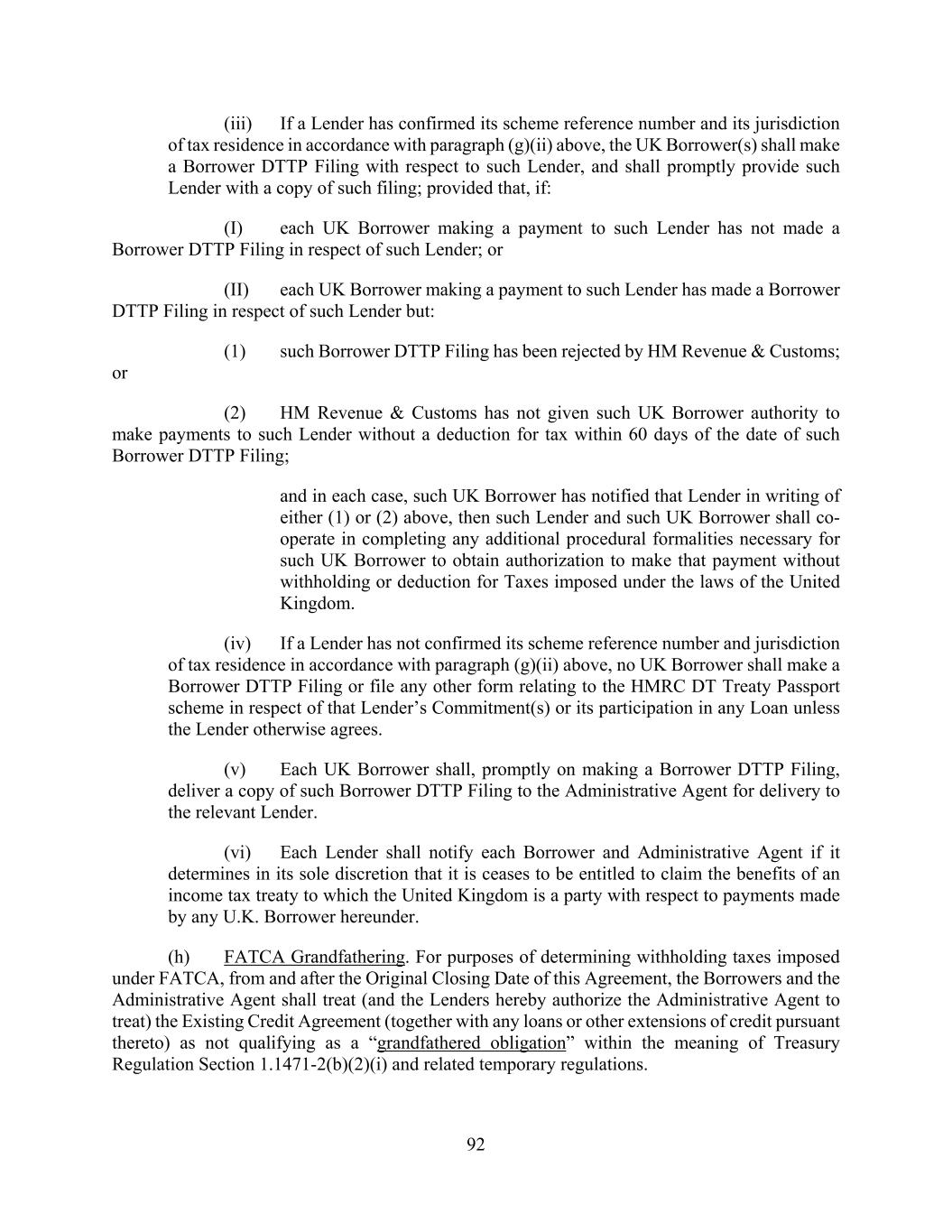 92(iii)如贷款人已根据上文(g)(ii)段确认其计划参考编号及其税务居住地的管辖权,则英国借款人应就该贷款人作出借款人DTTP备案,并应迅速向该贷款人提供该备案的副本;但,如果:(i)向该贷款人付款的每个英国借款人均未就该贷款人进行借款人DTTP备案;或(ii)向该贷款人付款的每个英国借款人均已就该贷款人进行借款人DTTP备案,但:(1)该借款人DTTP备案已被英国税务海关拒绝;或(2)英国税务海关未授权该英国借款人在该借款人DTTP备案之日起60天内向该贷款人付款而不扣除税款;且在每种情况下,该英国借款人已就上述第(1)或(2)款书面通知该贷款人,则该贷款人和该英国借款人应合作完成该英国借款人获得授权支付该款项所需的任何额外程序手续,而无需预扣或扣除根据英国法律征收的税款。(iv)如果贷款人未根据上文(g)(ii)段确认其计划参考编号和税务居住地的管辖权,则任何英国借款人不得就该贷款人的承诺或其参与任何贷款向借款人提交DTTP备案或提交与HMRC DT条约护照计划有关的任何其他表格,除非贷款人另有约定。(v)每一英国借款人应在作出借款人DTTP备案后立即将该借款人DTTP备案的副本交付给行政代理人,以交付给相关贷款人。(vi)每一贷款人如自行决定不再有权就任何英国借款人根据本协议支付的款项主张英国作为缔约方的所得税条约的利益,则应通知每一借款人和行政代理人。(h)FATCA祖父。为确定根据FATCA征收的预扣税,自本协议的原始截止日期起及之后,借款人和行政代理人应将(贷款人特此授权行政代理人处理)现有信贷协议(连同根据该协议提供的任何贷款或其他信贷延期)视为不符合财政部条例第1.1471-2(b)(2)(i)节和相关临时条例含义内的“祖父义务”的资格。