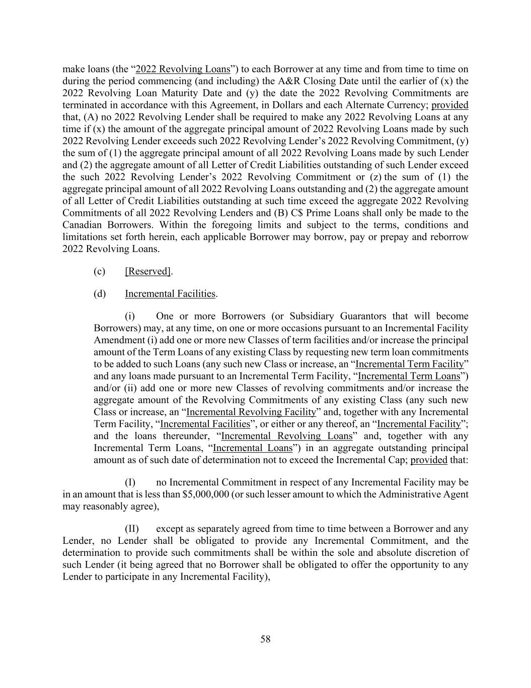 58在A & R截止日开始(包括)至(x)2022年循环贷款到期日和(y)2022年循环承诺根据本协议终止之日(以较早者为准)的期间内,以美元和每种替代货币向每一借款人提供贷款(“2022年循环贷款”),但前提是,(a)如(x)该2022循环贷款人作出的2022循环贷款本金总额超过该2022循环贷款人的2022循环承诺,则不得要求该2022循环贷款人在任何时间作出任何2022循环贷款,(y)(1)该贷款人作出的所有2022年循环贷款的本金总额及(2)该贷款人未偿还的所有信用证负债的总额超过该2022年循环贷款人的2022年循环承诺或(z)(1)所有未偿还的2022年循环贷款的本金总额及(2)当时未偿还的所有信用证负债的总额超过所有2022年循环贷款人的2022年循环承诺总额及(b)仅向加拿大借款人作出加元优惠贷款的总和。在上述限制范围内,并在遵守本协议规定的条款、条件和限制的前提下,每个适用的借款人可以借入、支付或预付和再借2022年循环贷款。(c)[保留]。(d)增量设施。(i)一个或多个借款人(或将成为借款人的附属担保人)可随时根据增量融资修正案(i)在一个或多个场合增加一个或多个新类别的定期融资和/或通过要求在此类贷款中增加新的定期贷款承诺(任何此类新类别或增加、“增量定期融资”以及根据增量定期融资提供的任何贷款,增加任何现有类别的定期贷款的本金金额,“增量定期贷款”)和/或(ii)增加一个或多个新类别的循环承诺和/或增加任何现有类别的循环承诺总额(任何此类新类别或增加,“增量循环融资”,连同任何增量定期融资、“增量融资”,或其中任何一项或任何一项,“增量融资”;及其项下的贷款,“增量循环贷款”,以及连同任何增量定期贷款,“增量贷款”)截至该确定日期的未偿本金总额不超过增量上限;但前提是:(i)任何增量融资的增量承诺金额不得低于5,000,000美元(或行政代理人可能合理同意的较低金额),(ii)除借款人与任何贷款人之间不时另行约定外,任何贷款人均无义务提供任何增量承诺,且提供此类承诺的决心应在该贷款人的唯一和绝对酌处权范围内(经商定,任何借款人均无义务向任何贷款人提供参与任何增量融资的机会),