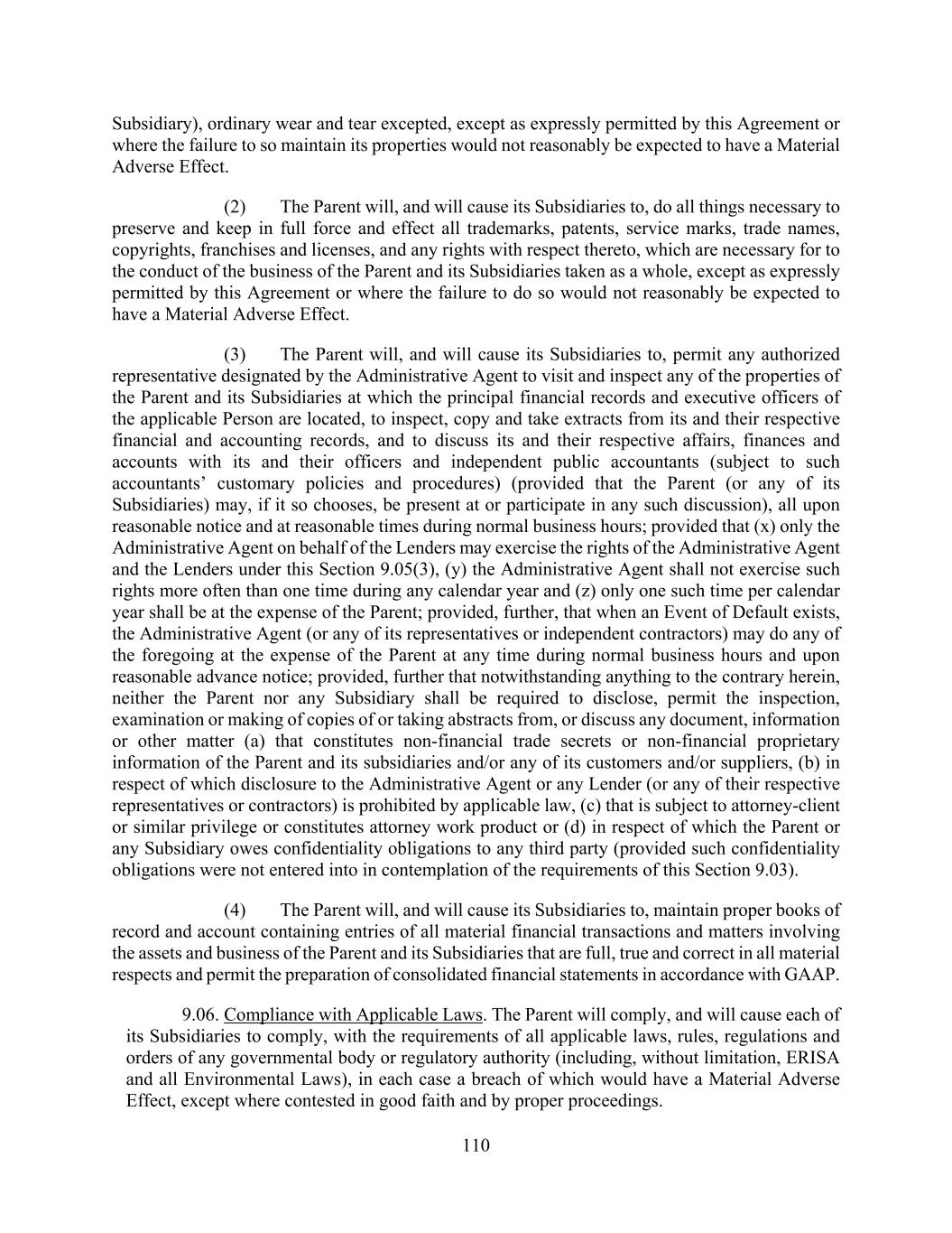 110附属公司),普通磨损除外,除非本协议明确允许或未能如此维护其财产不会合理地预期会产生重大不利影响。(2)母公司将并将促使其子公司采取一切必要措施,以维护和保持所有商标、专利、服务标志、商号、版权、特许经营权和许可,以及与此相关的任何权利,这些权利对于母公司及其子公司作为一个整体开展业务是必要的,除非本协议明确允许或如果不这样做不会合理地预期会产生重大不利影响。(3)母公司将并将促使其子公司允许行政代理人指定的任何授权代表访问和检查适用人的主要财务记录和执行官所在的母公司及其子公司的任何财产,检查、复制和提取其及其各自财务和会计记录的摘录,并讨论其及其各自的事务,与其及其高级职员和独立公共会计师的财务和账目(须遵守这些会计师的惯常政策和程序)(前提是母公司(或其任何子公司)如选择出席或参与任何此类讨论),所有这些均应在合理通知下和在正常营业时间内的合理时间进行;但(x)只有代表贷款人的行政代理人才能根据本条第9.05(3)款行使行政代理人和贷款人的权利,(y)行政代理人在任何历年行使该等权利的次数不得超过一次,且(z)每个历年只有一次该等时间须由家长承担费用;此外,条件是,当存在违约事件时,行政代理人(或其任何代表或独立承建商)可在正常营业时间内的任何时间并在合理的事先通知下,由家长承担上述任何费用;但进一步规定,尽管本条例另有相反规定,不得要求母公司或任何附属公司披露,允许查阅、审查或制作任何文件、信息或其他事项的副本或摘要,或讨论任何文件、信息或其他事项(a)构成母公司及其子公司和/或其任何客户和/或供应商的非财务商业秘密或非财务专有信息,(b)适用法律禁止向行政代理人或任何贷款人(或其各自的任何代表或承包商)披露,(c)受制于律师-委托人或类似特权或构成律师工作产品或(d)母公司或任何子公司对任何第三方负有保密义务的(前提是在考虑本条第9.03条的要求时未订立此类保密义务)。(4)母公司将并将促使其子公司保持适当的记录和账簿,其中包含涉及母公司及其子公司的资产和业务的所有重大财务交易和事项的分录,这些分录在所有重大方面都是完整、真实和正确的,并允许按照公认会计原则编制合并财务报表。9.06.遵守适用法律。母公司将遵守,并将促使其每个子公司遵守任何政府机构或监管机构的所有适用法律、规则、条例和命令(包括但不限于ERISA和所有环境法)的要求,在每种情况下,违反这些法律、规则、条例和命令将产生重大不利影响,除非出于善意和通过适当程序提出异议。