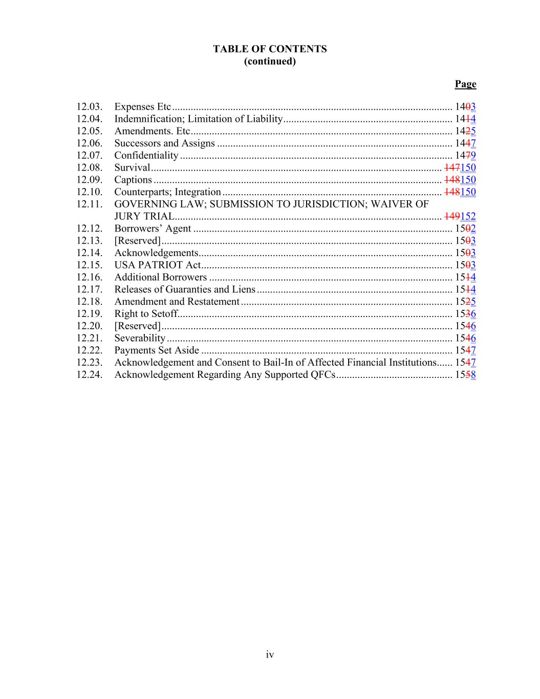 目录(续)第四页12.03。费用等.................................................................................................... 140312.04。赔偿;责任限制......................................................................141412.05。修正。等...................................................................................................1 42512.06。继任者和分配人.................................................................................... 144712.07。保密...................................................................................................147912.08。生存.................................................................................................... 14715012.09。字幕.................................................................................................... 14815012.10。对口单位;整合...................................................................................14815012.11。管辖法律;提交司法管辖;放弃陪审团审判.................................................................................................... 14915212.12。借款人的代理人.................................................................................................... 150212.13。【保留】......................................................................................................1 50312.14。致谢.................................................................................... 150312.15。美国爱国者法案.................................................................................... 150312.16。额外借款人....................................................................................................15 1412.17。担保和留置权的解除.................................................................... 151412.18。修订及重述.................................................................................... 152512.19。抵销权......................................................................................................153612.20。【保留】......................................................................................................154612.21。可分割性......................................................................................................154612.22。搁置付款......................................................................................................154712.23。受影响金融机构的保释金认可书及同意书.....。1547 12.24.关于任何受支持的QFII的致谢.................................................... 1558