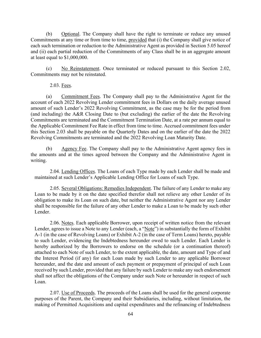 64(b)可选。公司有权随时或不时终止或减少任何未使用的承诺,但(i)公司须按本条例第5.05条的规定向行政代理人发出每项该等终止或减少的通知,及(ii)任何类别的承诺的每项部分减少的总额应至少等于1,000,000美元。(c)不得复职。一旦根据本第2.02节终止或减少,承付款项不得恢复。2.03.费用。(a)承诺费。公司须就该贷款人的2022年循环承诺的每日平均未使用金额(视属何情况而定)向行政代理人支付每笔2022年循环贷款人承诺费,金额为美元,由(及包括)A & R截止日至(但不包括)循环承诺终止日期与承诺终止日期两者中较早者的期间,按相等于不时生效的适用承诺费率的年费率支付。本款2.03项下的应计承诺费应在季度日期以及2022年循环承诺终止日期和2022年循环贷款到期日期中较早的日期支付。(b)代理费。公司应当按照公司与行政代理人书面约定的金额和时间向行政代理人支付代理费用。2.04.贷款办公室。各贷款人发放的各类贷款,应当在该贷款人适用的该类贷款办公室发放和维持。2.05.若干义务:补救措施独立。任何贷款人未能在指明日期作出由其作出的任何贷款,并不解除任何其他贷款人在该日期作出其贷款的义务,但行政代理人或任何贷款人均不对任何其他贷款人未能作出由该其他贷款人作出的贷款负责。2.06.笔记。每一适用的借款人在收到相关贷款人的书面通知后,同意向本协议中的任何贷款人发行一份票据(每份票据,“票据”),其形式基本上为附件 A-1(在循环贷款的情况下)或附件 A-2(在定期贷款的情况下),应支付给该贷款人,以证明在本协议项下欠该贷款人的债务。借款人特此授权各贷款人在该贷款人的每张票据所附的附表(或其延续)上(在适用范围内)背书该贷款人根据本协议向任何适用的借款人作出的每笔贷款的日期、金额和类型以及利息期(如有),以及该贷款人收到的每笔支付或提前偿还该贷款本金的日期和金额,但该等贷款人未能作出任何该等背书,不影响公司根据该票据或本协议就该等贷款承担的义务。2.07.收益用途。贷款所得款项将用于母公司、公司及其子公司的一般公司用途,包括但不限于进行许可的收购和资本支出以及债务的再融资