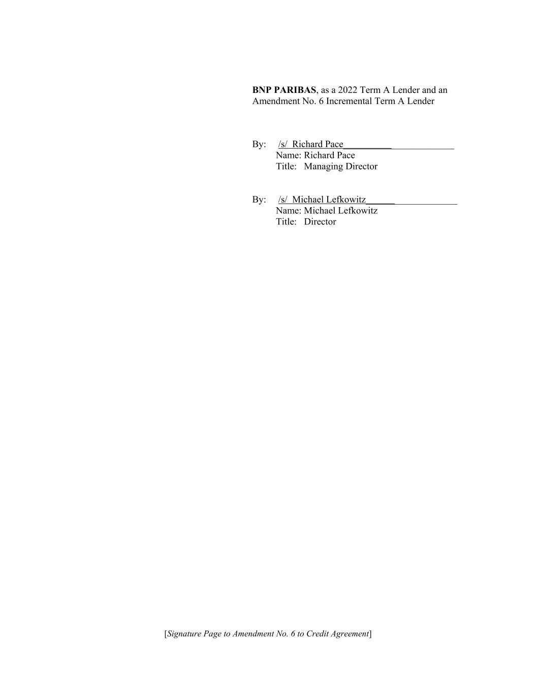【信贷协议第6号修正案签署页】法国巴黎银行,作为2022年期限贷款人和第6号修正案增量期限贷款人:/s/Richard Pace ______________________姓名:Richard Pace职务:董事总经理:/s/Michael Lefkowitz __________________姓名:Michael Lefkowitz职务:董事
