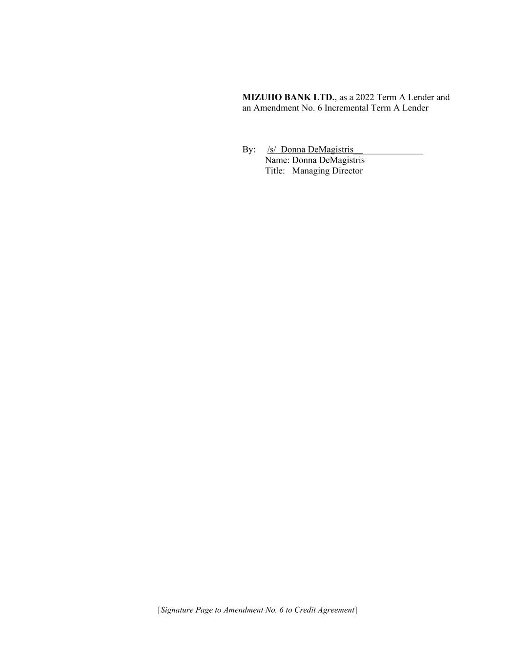 【信贷协议第6号修正案签署页】MIZUHO BANK LTD.,作为2022年期限贷款人和第6号修正案增量期限贷款人:/s/Donna DeMagistris ______________姓名:Donna DeMagistris职务:董事总经理