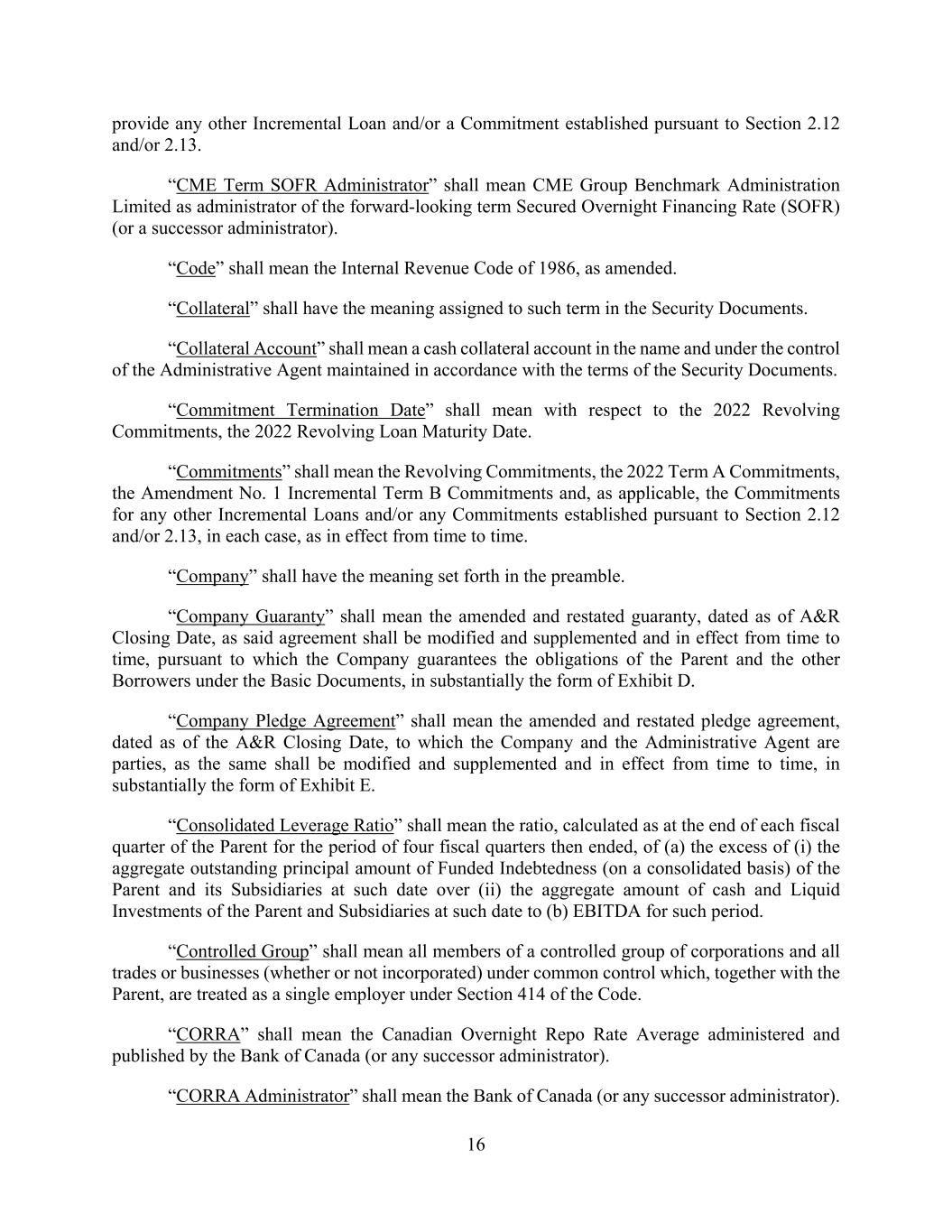 16提供任何其他增量贷款和/或根据第2.12和/或2.13节确立的承诺。“CME术语SOFR管理人”是指担任前瞻性术语有担保隔夜融资利率(SOFR)管理人(或继任管理人)的芝加哥商品交易所 BenchMark Administration Limited。“法典”是指经修订的1986年《国内税收法典》。“抵押品”应具有担保文件中赋予该术语的含义。“抵押账户”是指根据担保文件条款维持的行政代理人名下并在其控制下的现金抵押账户。“承诺终止日”是指就2022年循环承诺而言,2022年循环贷款到期日。“承诺”是指循环承诺、2022年A期承诺、修订第1号增量B期承诺,以及(如适用)任何其他增量贷款的承诺和/或根据第2.12和/或2.13节确立的任何承诺,在每种情况下,不时生效。“公司”应具有序言中阐述的含义。“公司担保”系指经修订和重述的担保,日期为A & R交割日,如所述协议应经修改和补充并不时生效,据此,公司对母公司和其他借款人在基本文件项下的义务提供担保,其形式实质上为附件 D。“公司质押协议”系指经修订和重述的质押协议,日期为A & R交割日,公司和行政代理人为其当事人,由于相同的将被修改和补充并不时生效,基本上以附件 E的形式出现。“综合杠杆率”是指在随后结束的四个财政季度期间,按母公司每个财政季度末计算的比率,(a)(i)母公司及其子公司在该日期的已融资债务的未偿还本金总额(以综合基准计算)超过(ii)母公司和子公司在该日期的现金和流动投资总额至(b)该期间的EBITDA的部分。“受控集团”是指受控的公司集团的所有成员以及在共同控制下与母公司一起根据《守则》第414条被视为单一雇主的所有行业或业务(无论是否成立)。“CORRA”是指加拿大央行(或任何继任管理人)管理和公布的加拿大隔夜回购利率平均值。“CORRA管理人”是指加拿大银行(或任何继任管理人)。