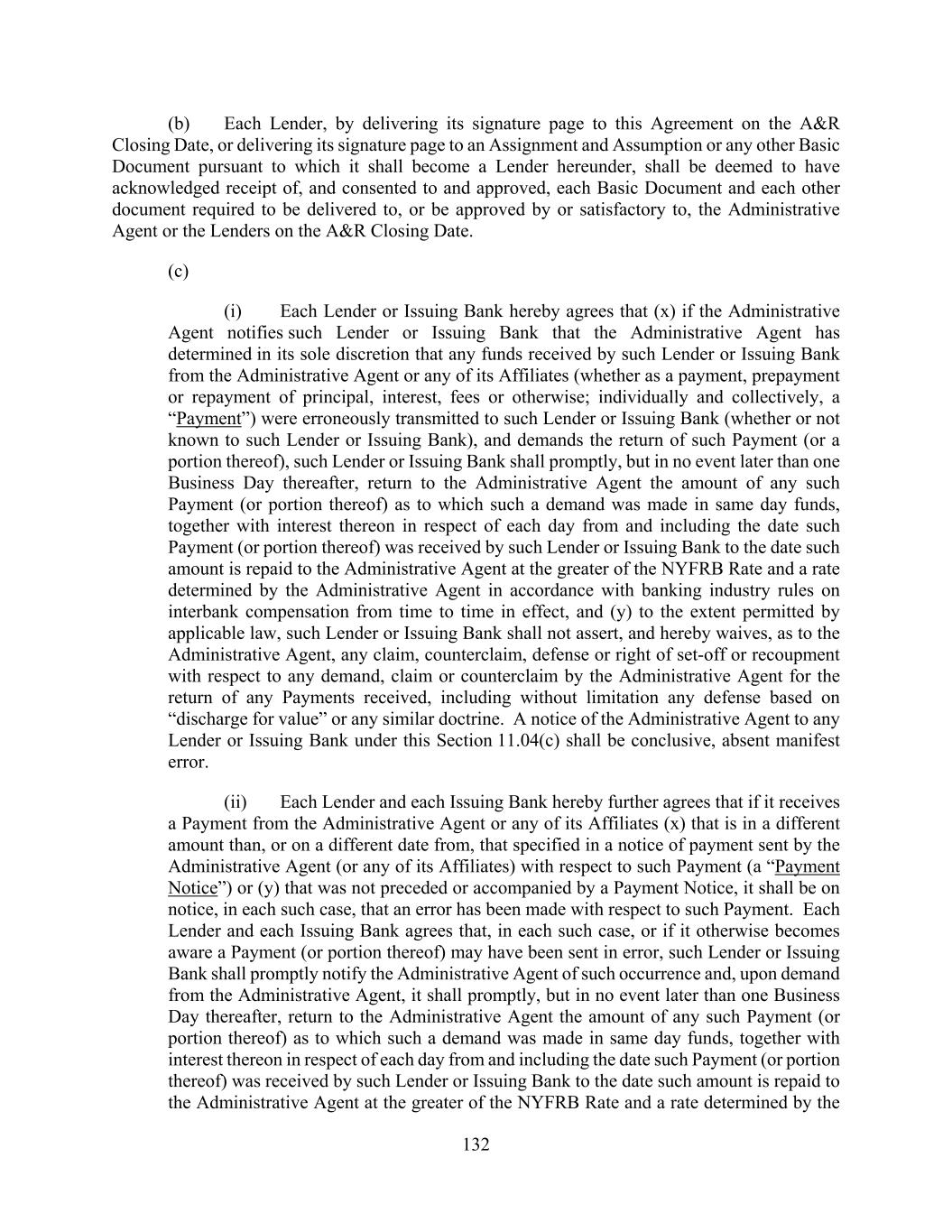 132(b)每名贷款人在A & R截止日期向本协议交付其签字页,或将其签字页交付转让和假设或任何其他基本文件,据此其将成为本协议项下的贷款人,应被视为已确认收到、同意和批准每一份基本文件以及在A & R截止日期需交付给行政代理人或贷款人、或经其批准或令其满意的其他文件。(c)(i)各贷款人或开证行在此同意(x)如行政代理人通知该贷款人或开证行,指该行政代理人已全权酌情决定该贷款人或开证行从该行政代理人或其任何关联机构收到的任何资金(不论是作为付款、提前偿还或偿还本金、利息、费用或其他;个别和集体的“付款”)被错误地传送给该贷款人或开证行(无论该贷款人或开证行是否知晓),并要求返还该等付款(或其中的一部分),该贷款人或开证银行应迅速(但在任何情况下不得迟于其后一个营业日)向行政代理人退还当日资金中提出该要求的任何该等付款(或其部分)的金额,连同自该贷款人或开证银行收到该等款项(或其部分)之日起计及包括该日在内的每一天的利息,直至该等款项按NYFRB利率和该行政代理人根据不时生效的银行业同业代偿规则确定的利率中的较高者偿还给行政代理人之日止,以及(y)在适用法律允许的范围内,该贷款人或开证银行不得主张,并在此放弃对行政代理人的任何索赔、反索赔,就行政代理人要求返还所收到的任何付款提出的任何要求、索赔或反索赔,包括但不限于基于“价值解除”或任何类似原则的任何抗辩,提出抗辩或抵消权或补偿权。行政代理人根据本条第11.04(c)款向任何贷款人或开证银行发出的通知应为结论性通知,无明显错误。(ii)各贷款人及各发行银行在此进一步同意,如其从行政代理人或其任何关联公司(x)收到的付款金额与行政代理人(或其任何关联公司)就该等付款发出的付款通知(“付款通知”)或(y)中指明的金额不同或日期不同,而该付款通知之前或之后均未附有付款通知,则在每一此种情况下,应在收到通知后就该等付款作出错误。各贷款人和各开证行同意,在每一此种情况下,或如其另有知悉某笔付款(或其部分)可能已发送错误,该贷款人或开证行应将此种情况的发生及时通知行政代理人,并应行政代理人的要求,迅速但在不迟于其后一个营业日的情况下,向行政代理人退还当日提出此种要求的任何此种付款(或其部分)的资金数额,连同自该贷款人或开证银行收到该等付款(或其部分)之日起至该款项按NYFRB利率和由