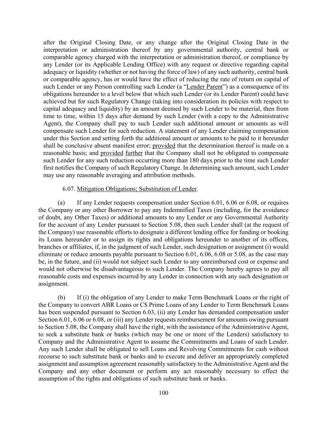 100在原截止日期后,或任何政府当局、中央银行或负责解释或管理其的可比机构在原截止日期后对其解释或管理的任何变更,或任何贷款人(或其适用的贷款办公室)遵守任何此类当局、中央银行或可比机构关于资本充足率或流动性(无论是否具有法律效力)的任何请求或指令,已经或将会产生影响,将该贷款人或控制该贷款人的任何人(“贷款人母公司”)因其在本协议下的义务而导致的资本回报率降低至低于该贷款人(或其贷款人母公司)本可达到的水平,但该监管变化(考虑到其有关资本充足率和流动性的政策)的金额被该贷款人认为是重大的,然后不时在该贷款人提出要求后15天内(连同一份副本给行政代理人),公司应向该贷款人支付额外的金额,以补偿该贷款人的此类减少。任何贷款人根据本条要求赔偿并载明根据本条将向其支付的额外金额或数额的陈述,在没有明显错误的情况下,应是结论性的;但其确定是在合理的基础上作出的;并进一步规定,公司没有义务就该贷款人首次通知公司该监管变更的时间之前超过180天发生的任何该等减少向该贷款人进行赔偿。在确定此类金额时,此类贷款人可以使用任何合理的平均和归属方法。6.07.缓解义务;替代贷款人。(a)如任何贷款人根据第6.01、6.06或6.08条要求赔偿,或要求公司或任何其他借款人根据第5.08条为任何贷款人的帐户向任何贷款人或任何政府当局支付任何弥偿税款(为免生疑问,包括任何其他税款)或额外款项,则该贷款人须(应公司的要求)作出合理努力,指定一个不同的贷款办事处,以资助或预订其在本协议下的贷款,或将其在本协议下的权利和义务转让给其另一办事处、分支机构或附属公司,如果,根据该贷款人的判决,该等指定或转让(i)将消除或减少未来根据第6.01、6.06、6.08或5.08节(视情况而定)应付的款项,及(ii)将不会使该贷款人承担任何未偿还的成本或开支,否则不会对该贷款人不利。本公司特此同意支付任何贷款人因任何此类指定或转让而产生的所有合理成本和费用。(b)如(i)任何贷款人作出定期基准贷款的义务或公司将任何贷款人的ABR贷款或加元优惠贷款转换为定期基准贷款的权利已根据第6.03条中止,(ii)任何贷款人已根据第6.01、6.06或6.08条要求赔偿,或(iii)任何贷款人根据第5.08条要求偿还所欠款项,公司有权在行政代理人的协助下,寻求公司和行政代理人满意的替代银行或银行(可能是放款人中的一家或多家)承担该放款人的承诺和贷款。任何该等贷款人有义务出售贷款和循环承诺以换取现金,而无需向该等替代银行或银行追索,并签署和交付行政代理人和公司合理满意的适当完成的转让和承担协议以及任何其他文件或履行任何合理必要的行为,以实现该等替代银行或银行的权利和义务的承担。