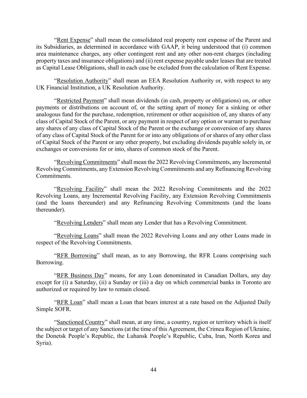 44“租金费用”系指根据公认会计原则确定的母公司及其子公司的合并不动产租金费用,据了解,(i)公共区域维护费用、任何其他或有租金和任何其他非租金费用(包括财产税和保险义务)和(ii)根据被视为资本租赁义务的租赁应付的租金费用,在每种情况下均应从租金费用的计算中排除。“解决机构”是指欧洲经济区解决机构,或就任何英国金融机构而言,是指英国解决机构。“限制性支付”是指为购买、赎回、报废或以其他方式获得母公司任何类别股本的任何股份而在(现金、财产或债务)上的股息,或因购买、赎回、报废或以其他方式获得的偿债基金或其他类似基金的款项而进行的其他支付或分配,或就购买母公司任何类别股本的任何股份的任何期权或认股权证或将母公司任何类别股本的任何股份交换或转换为母公司任何其他类别股本或任何其他财产的任何义务或股份的任何付款,但不包括仅在母公司普通股股份中支付的股息,或交换或转换为或转换为母公司普通股股份。“循环承诺”是指2022年循环承诺、任何增量循环承诺、任何延期循环承诺和任何再融资循环承诺。“循环贷款”是指2022年循环承诺和2022年循环贷款、任何增量循环贷款、任何延期循环承诺(及其项下的贷款)和任何再融资循环承诺(及其项下的贷款)。“循环出借人”是指有循环承诺的任何出借人。「循环贷款」指2022年循环贷款及就循环承诺作出的任何其他贷款。“RFR借款”是指,就任何借款而言,构成此类借款的RFR借款。“RFR营业日”是指,对于任何以加元计价的贷款,除(i)星期六、(ii)星期日或(iii)法律授权或要求多伦多商业银行继续关闭的日子外的任何一天。“RFR贷款”是指按调整后的每日简单SOFR利率计息的贷款。“被制裁国家”是指在任何时候,本身就是任何制裁对象或目标的国家、地区或领土(在本协定签署时,乌克兰克里米亚地区、顿涅茨克人民共和国、卢甘斯克人民共和国、古巴、伊朗、朝鲜和叙利亚)。