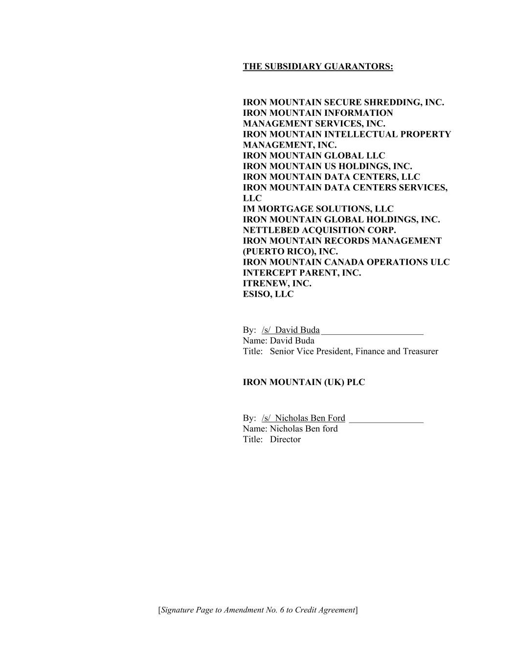 【信贷协议第6号修正案签署页】附属担保人:IRON MOUNTAIN SECURE SHREDING,INC。铁山信息管理服务公司。Iron Mountain Intellectual Property Management,INC。IRON MOUNTAIN GLOBAL LLC IRON MOUNTAIN US HOLDINGS,INC。IRON MOUNTAIN DATA CENTERS,LLC IRON MOUNTAIN DATA CENTERS SERVICES,LLC IM MORTGAGE SOLUTIONS,LLC IRON MOUNTAIN Global HOLDINGS,INC。NETTLEBED ACQISITION CORP。Iron Mountain Records Management(波多黎各),INC。Iron Mountain Canada Operations ULC INTERCEPT Parent,INC。ITRENEW,INC。ESISO,LLC by:/s/David Buda ______________________ Name:David Buda Title:高级副总裁、财务和财务主管IRON MOUNTAIN(UK)PLC by:/s/Nicholas Ben Ford ______________ Name:Nicholas Ben ford Title:Director