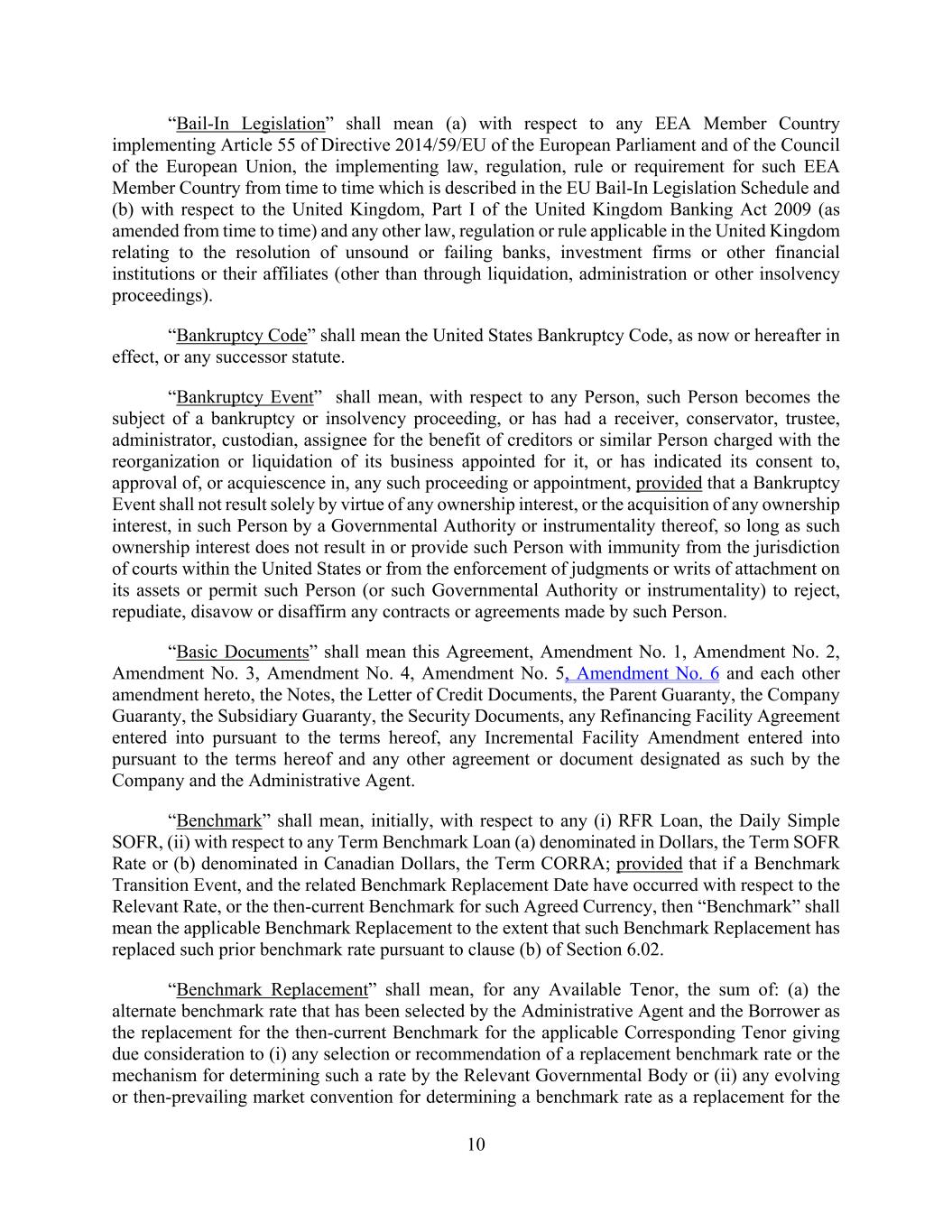 10“纾困立法”是指(a)就任何实施欧洲议会和欧盟理事会第2014/59/EU号指令第55条的欧洲经济区成员国而言,欧盟纾困立法附表中不时描述的对该欧洲经济区成员国的实施法律、条例、规则或要求,以及(b)就英国而言,《2009年英国银行法》(不时修订)第一部分和任何其他法律,英国适用的与解决不健全或倒闭的银行、投资公司或其他金融机构或其关联公司(通过清算、管理或其他破产程序除外)有关的法规或规则。“破产法”是指与现在或以后一样有效的美国破产法,或任何后续法规。“破产事件”是指,就任何人而言,该人成为破产或破产程序的主体,或为债权人或被控对其业务进行重组或清算的类似人的利益而指定了接管人、保管人、受托人、管理人、托管人、受让人,或已表示同意、批准或默许任何此类程序或指定,但破产事件不应仅因政府当局或其工具在该人身上的任何所有权权益或任何所有权权益的取得而导致,只要这种所有权权益不会导致或提供该人免于美国境内法院的管辖权或免于对其资产执行判决或扣押令状,或允许该人(或该政府当局或工具)拒绝、否定、否认或否认该人订立的任何合同或协议。“基本文件”系指本协议、第1号修订、第2号修订、第3号修订、第4号修订、第5号修订、第6号修订及本协议的相互修订、票据、信用证单据、母担保、公司担保、附属担保、担保单据、根据本协议条款订立的任何再融资融资协议、根据本协议条款订立的任何增量融资修订以及公司和行政代理人指定的任何其他协议或文件。“基准”最初是指,就任何(i)RFR贷款而言,每日简单SOFR,(ii)就任何(a)以美元计价的定期基准贷款而言,定期SOFR利率或(b)以加元计价的期限CORRA;前提是,如果发生了基准过渡事件,并且相关的基准替换日期已经发生在相关利率方面,或此类约定货币当时的基准,则“基准”应指适用的基准替换,前提是此类基准替换已根据第6.02条(b)款取代了此类先前的基准利率。“基准替代”就任何可用的期限而言,是指:(a)行政代理人和借款人选择的替代基准利率,作为当时适用的相应期限的替代基准,并适当考虑到(i)相关政府机构对替代基准利率或确定此类利率的机制的任何选择或建议,或(ii)任何正在演变或当时盛行的确定基准利率的市场惯例,以替代