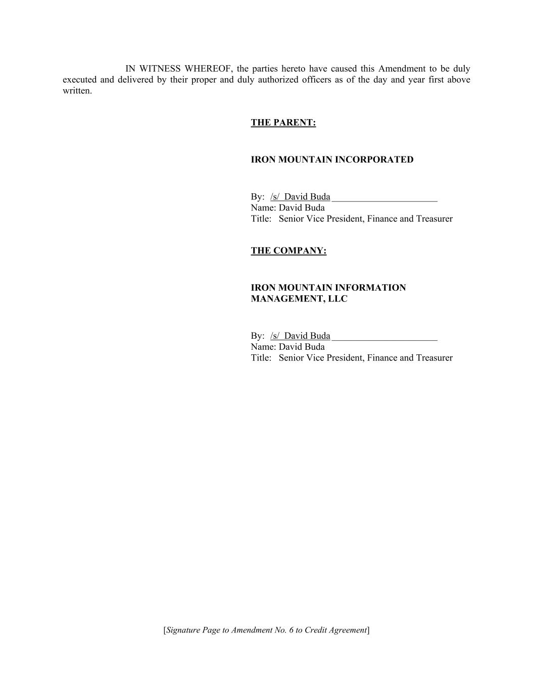 【信贷协议第6号修正案的签署页】作为证明,本协议各方已安排本修正案在上述日期和年份的第一天由其适当和正式授权的官员正式签署和交付。母公司:IRON MONTAIN公司成立日期:/s/David Buda ______________________姓名:David Buda职务:高级副总裁、财务和财务主管公司:IRON MONTAIN INFORMATION MAGEMENT,LLC由:/s/David Buda __________________姓名:David Buda职务:高级副总裁、财务和财务主管
