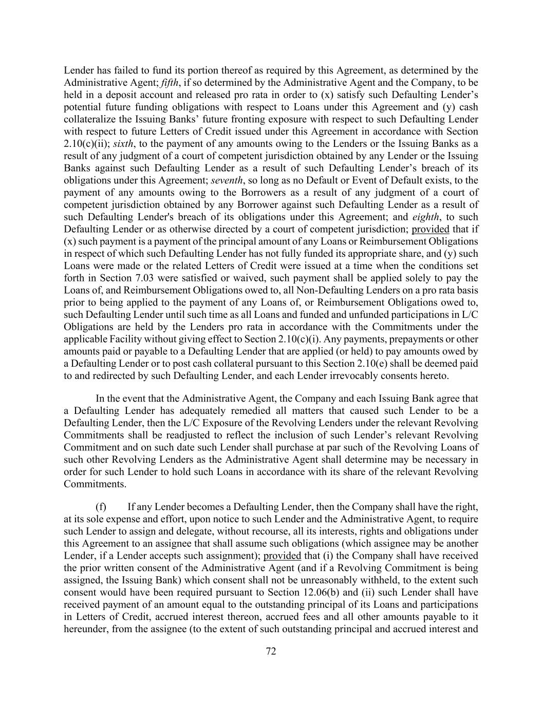 72贷款人未能按照行政代理人确定的本协议要求为其部分提供资金;第五,如果行政代理人和公司如此确定,则应将其存放在存款账户中并按比例释放,以便(x)满足该违约贷款人与本协议项下贷款相关的潜在未来融资义务,以及(y)以现金抵押开证银行与该违约贷款人就根据本协议根据第2.10(c)(ii)节签发的未来信用证相关的未来前向风险敞口;第六,对于任何贷款人或发行银行因该违约贷款人违反其在本协议下的义务而针对该违约贷款人获得的任何有管辖权的法院判决而欠贷款人或发行银行的任何款项的支付;第七,只要不存在违约或违约事件,支付任何借款人因该违约贷款人违反其在本协议下的义务而对该违约贷款人作出的任何有管辖权的法院的判决而欠该借款人的任何款项;第八,支付给该违约贷款人或根据有管辖权的法院的其他指示;但如果(x)该等付款是支付该违约贷款人尚未为其适当份额提供全部资金的任何贷款或偿还义务的本金,(y)该等贷款是在第7.03条所列条件得到满足或放弃的时候作出的,或有关信用证的签发,该等付款应仅用于按比例支付所有非违约贷款人的贷款和所欠的偿还义务,然后再用于支付任何贷款或所欠的偿还义务,此类违约贷款人,直至所有贷款以及有资金和无资金参与的信用证债务由贷款人根据适用融资机制下的承诺按比例持有,而不影响第2.10(c)(i)节。根据本条第2.10(e)款申请(或持有)用于支付违约贷款人所欠款项或提供现金抵押品的任何已支付或应付给违约贷款人的付款、预付款或其他金额,应被视为已支付给该违约贷款人并由该违约贷款人重新定向,且每个贷款人均不可撤销地同意此项协议。如行政代理人、本公司及各发行银行同意某违约贷款人已对导致该贷款人为违约贷款人的所有事项进行充分补救,然后,循环贷款人在相关循环承诺下的信用证风险敞口应重新调整,以反映包含该贷款人的相关循环承诺,并且在该日期,该贷款人应按面值购买行政代理人确定可能需要的其他循环贷款人的循环贷款,以便该贷款人按照其在相关循环承诺中所占份额持有此类贷款。(f)如任何贷款人成为违约贷款人,则公司有权在接到该贷款人和行政代理人的通知后,自费并尽力要求该贷款人将其在本协议下的所有权益、权利和义务无偿转让和转授给应承担该等义务的受让人(如果贷款人接受该转让,该受让人可能是另一贷款人);但(i)公司应已收到该行政代理人的事先书面同意(如果正在转让循环承诺,不得无理拒绝同意的开证行),但以根据第12.06(b)和(ii)条本应要求的同意为限,该贷款人应已从受让人收到相当于其贷款和参与信用证的未偿本金、应计利息、应计费用和根据本协议应付给它的所有其他款项的付款(以该未偿本金和应计利息及