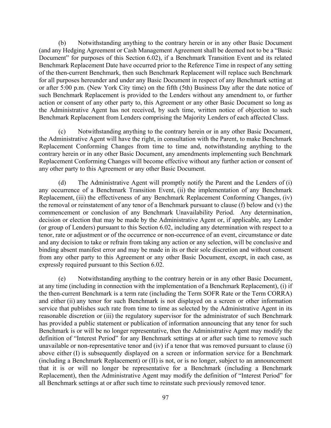 97(b)尽管本文或任何其他基本文件中有任何相反的规定(且就本第6.02条而言,任何套期保值协议或现金管理协议应被视为不是“基本文件”),如果就当时基准的任何设定而言,基准过渡事件及其相关的基准更换日期发生在参考时间之前,然后,此种基准更换将在下午5:00或之后向贷款人提供此类基准更换通知之日后的第五(5)个工作日(纽约市时间)为本协议项下和任何基本文件项下有关任何基准设置的所有目的更换此类基准,而无需对本协议或任何其他基本文件作出任何修改,或任何其他方采取进一步行动或同意,只要该行政代理人在该时间尚未收到,由每个受影响类别的多数贷款人组成的贷款人提出的反对此类基准更换的书面通知。(c)尽管本协议或任何其他基本文件中有任何相反的规定,行政代理人将有权在与母公司协商后,不时作出基准替换符合更改,并且尽管本协议或任何其他基本文件中有任何相反规定,任何实施此类基准替换符合更改的修订将生效,而无需本协议或任何其他基本文件的任何其他方采取任何进一步行动或同意。(d)行政代理人将(i)任何基准转换事件的发生,(ii)任何基准更换的实施,(iii)任何基准更换符合变更的有效性,(iv)根据下文(f)条取消或恢复基准的任何期限,以及(v)任何基准不可用期限的开始或结束,迅速通知母公司和贷款人。行政代理人或(如适用)任何贷款人(或一组贷款人)根据本条第6.02条可能作出的任何决定、决定或选择,包括有关期限、费率或调整的任何决定,或有关某一事件、情况或日期的发生或不发生的任何决定,以及任何采取或不采取任何行动或任何选择的决定,在没有明显错误的情况下,将是决定性和具有约束力的,并可由其或其自行酌情作出,且无需获得本协议或任何其他基本文件的任何其他方的同意,但,在每种情况下,根据本条第6.02款的明确要求。(e)尽管本文或任何其他基本文件有任何相反规定,但在任何时间(包括与实施基准更换有关),(i)如当时的基准为定期利率(包括定期SOFR利率或定期CORRA),且(ii)该基准的任何期限未显示在不时公布行政代理人以其合理酌情权选定的该利率的屏幕或其他信息服务上,或(iii)该基准管理人的监管主管已提供公开声明或公布信息,宣布该基准的任何期限不再具有或将不再具有代表性,然后,行政代理人可以在该时间或之后修改任何基准设置的“利息期”定义,以删除此类不可用或不具有代表性的期限,以及(iv)如果根据上文第(i)款(i)项中的任何一项被删除的期限随后显示在基准(包括基准替换)或(II)的屏幕或信息服务上,则不是或不再受其现在或将不再具有基准(包括基准替换)代表性的公告的约束,然后,行政代理人可以在该时间或之后修改所有基准设置的“利息期”定义,以恢复该先前取消的期限。