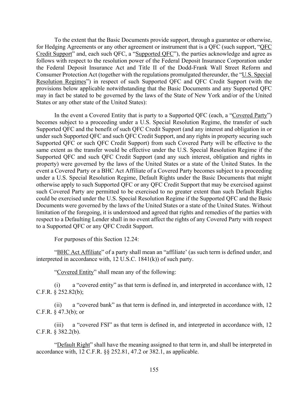 155如果基本文件通过担保或其他方式为套期保值协议或属于QFC的任何其他协议或工具(此类支持、“QFC信用支持”,以及每一此类QFC、“受支持的QFC”)提供支持,则各方就联邦存款保险公司根据《联邦存款保险法》和《多德-弗兰克华尔街改革和消费者保护法》第二章(连同根据该法案颁布的条例,“美国特别决议制度”)就此类受支持的QFC和QFC信贷支持(尽管基本文件和任何受支持的QFC实际上可能被声明受纽约州和/或美国或美国任何其他州的法律管辖,但仍适用以下规定):如果作为受支持的QFC缔约方的涵盖实体(各自称为“涵盖方”)成为美国特别决议制度下的程序的主体,此类受支持的QFC的转让和此类QFC信用支持的利益(以及此类受支持的QFC和此类QFC信用支持中或其下的任何利益和义务,以及为此类受支持的QFC或此类QFC信用支持提供担保的财产的任何权利)从此类覆盖方获得的转让将具有同等程度的效力,如果受支持的QFC和此类QFC信用支持(以及任何此类利益,义务和财产权利)受美国或美国某州法律管辖。如果覆盖方或覆盖方的BHC法案关联公司受到美国特别决议制度下的程序的约束,则允许行使基本文件下可能以其他方式适用于此类受支持的QFC或可能针对此类覆盖方行使的任何QFC信用支持的违约权,其程度不超过如果所支持的QFC和基本文件受美国法律或美国某州法律管辖,则根据美国特别决议制度可行使的此类违约权。在不受前述限制的情况下,理解并同意,当事人对违约贷款人的权利和补救措施在任何情况下均不影响任何覆盖方对所支持的QFC或任何QFC信用支持的权利。就本第12.24条而言:一方的“BHC Act Affiliate”系指该方的“affiliate”(该术语根据12 U.S.C. 1841(k)定义并根据其解释)。“涵盖实体”是指以下任何一种情况:(i)“涵盖实体”,该术语在12 C.F.R. § 252.82(b)中定义并按照其解释;(ii)“涵盖银行”,因为该术语在12 C.F.R. § 47.3(b)中定义并按照其解释;或(iii)“涵盖FSI”,该术语在12 C.F.R. § 382.2(b)中定义并按照其解释。“违约权”应具有12 C.F.R. § § 252.81、47.2或382.1(如适用)中赋予该词的含义,并应按照该含义进行解释。