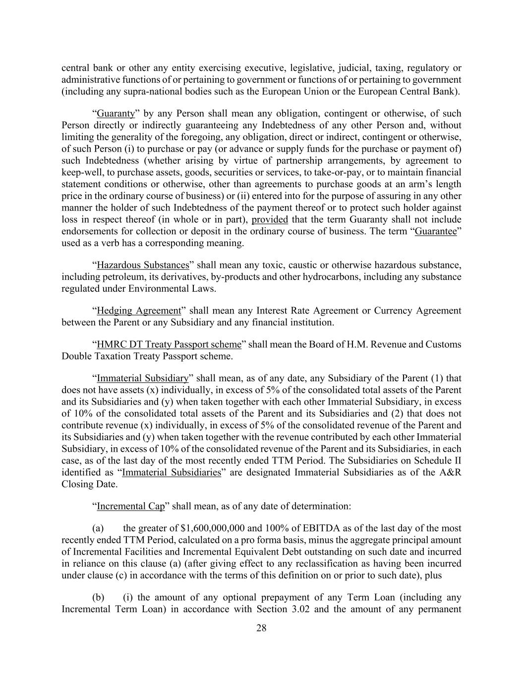 28中央银行或其他行使政府行政、立法、司法、税收、监管或行政职能或与政府职能有关或与政府职能有关的任何实体(包括欧盟或欧洲中央银行等任何超国家机构)。任何人的“担保”系指该人直接或间接为任何其他人的任何债务提供担保的任何义务(或有的或其他),以及在不限制前述一般性的情况下,该人的任何直接或间接、或有的或其他义务(i)购买或支付(或为购买或支付垫付或提供资金)该等债务(无论是因合伙安排、通过协议保持良好、购买资产、货物、证券或服务、照付不议、或维持财务报表条件或其他方式产生,在正常业务过程中以公平价格购买货物的协议除外)或(ii)为以任何其他方式向该等债务的持有人保证其付款或为保护该持有人免受有关损失(全部或部分)而订立的协议,但条款担保不得包括在正常业务过程中收取或存入的背书。作为动词的“保证”一词,有相应的含义。“有害物质”是指任何有毒、腐蚀性或其他有害物质,包括石油、其衍生物、副产品和其他碳氢化合物,包括受环境法监管的任何物质。“套期保值协议”是指母公司或任何子公司与任何金融机构之间的任何利率协议或货币协议。“HMRC DT条约护照计划”是指H.M.税务和海关双重征税条约护照计划的董事会。“非物质子公司”是指,截至任何日期,母公司的任何子公司(1)单独不拥有资产(x),超过母公司及其子公司合并总资产的5%,以及(y)与其他非物质子公司合并计算时,超过母公司及其子公司合并总资产的10%,以及(2)单独不贡献收入(x),超过母公司及其子公司合并收入的5%,以及(y)与其他非物质子公司合并计算时,超过母公司及其子公司合并收入的10%,在每种情况下,截至最近结束的TTM期间的最后一天。附表II中被确定为“非物质子公司”的子公司在A & R截止日被指定为非物质子公司。“增量上限”是指,截至任何确定日期:(a)以备考方式计算的截至最近结束的TTM期间最后一天的EBITDA的1,600,000,000美元和100%中的较高者,减去在该日期因依赖本(a)条而产生的增量融资和增量等值债务的本金总额(在根据本定义条款在该日期或之前发生的任何重新分类生效后),加上(b)(i)根据第3.02条可选择提前偿还任何定期贷款(包括任何增量定期贷款)的金额及任何永久