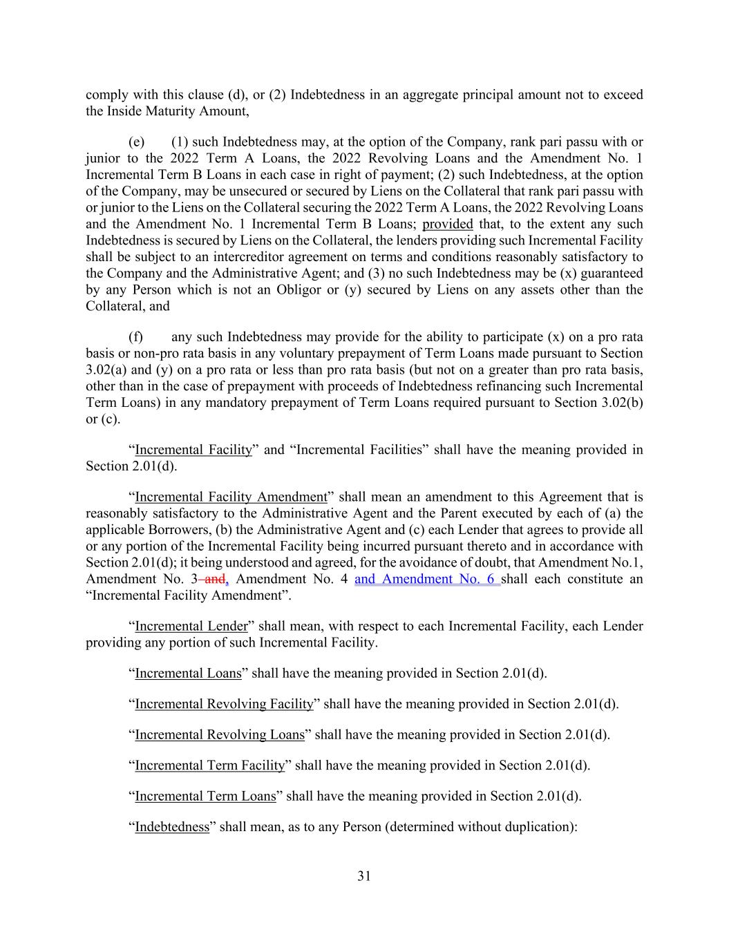 31遵守本条款(d),或(2)本金总额不超过内部到期金额的债务,(e)(1)该等债务可由公司选择在每种情况下与2022年A期贷款、2022年循环贷款和修订第1号增量B期贷款享有同等地位或低于受付权;(2)该等债务,由公司选择,可以无担保或由抵押品上的留置权担保,该留置权与担保2022年A期贷款、2022年循环贷款和第1号修正案增量B期贷款的抵押品上的留置权具有同等地位或低于其留置权;但前提是,在任何此类债务由抵押品上的留置权担保的范围内,提供该等增量融资的贷款人须受公司及行政代理人合理满意的条款及条件的债权人间协议所规限;及(3)该等债务不得由任何非债务人的人(x)担保,或(y)以抵押品以外的任何资产的留置权作担保,(f)任何此类债务可规定有能力按比例或非按比例参与(x)根据第3.02(a)和(y)节按比例或低于按比例(但不能以高于按比例的基础,但以债务收益再融资此类增量定期贷款的情况除外)根据第3.02(b)或(c)节要求的任何强制性提前偿还定期贷款。“增量融资”和“增量融资”应具有第2.01(d)节规定的含义。“增量融资修正”系指由(a)适用的借款人、(b)行政代理人和(c)同意提供根据该协议并根据第2.01(d)节产生的全部或任何部分增量融资的每个贷款人各自执行的、行政代理人和母公司合理满意的对本协议的修正;为免生疑问,理解并同意第1号修正案、第3号修正案以及第4号修正案和第6号修正案应各自构成“增量融资修正”。“增量贷款人”是指,就每笔增量融资而言,每笔提供此类增量融资任何部分的贷款人。“增量贷款”应具有第2.01(d)节规定的含义。“增量循环贷款”应具有第2.01(d)节规定的含义。“增量循环贷款”应具有第2.01(d)节规定的含义。“增量期限便利”应具有第2.01(d)节规定的含义。“增量定期贷款”应具有第2.01(d)节规定的含义。“负债”是指,对于任何人(不重复确定):