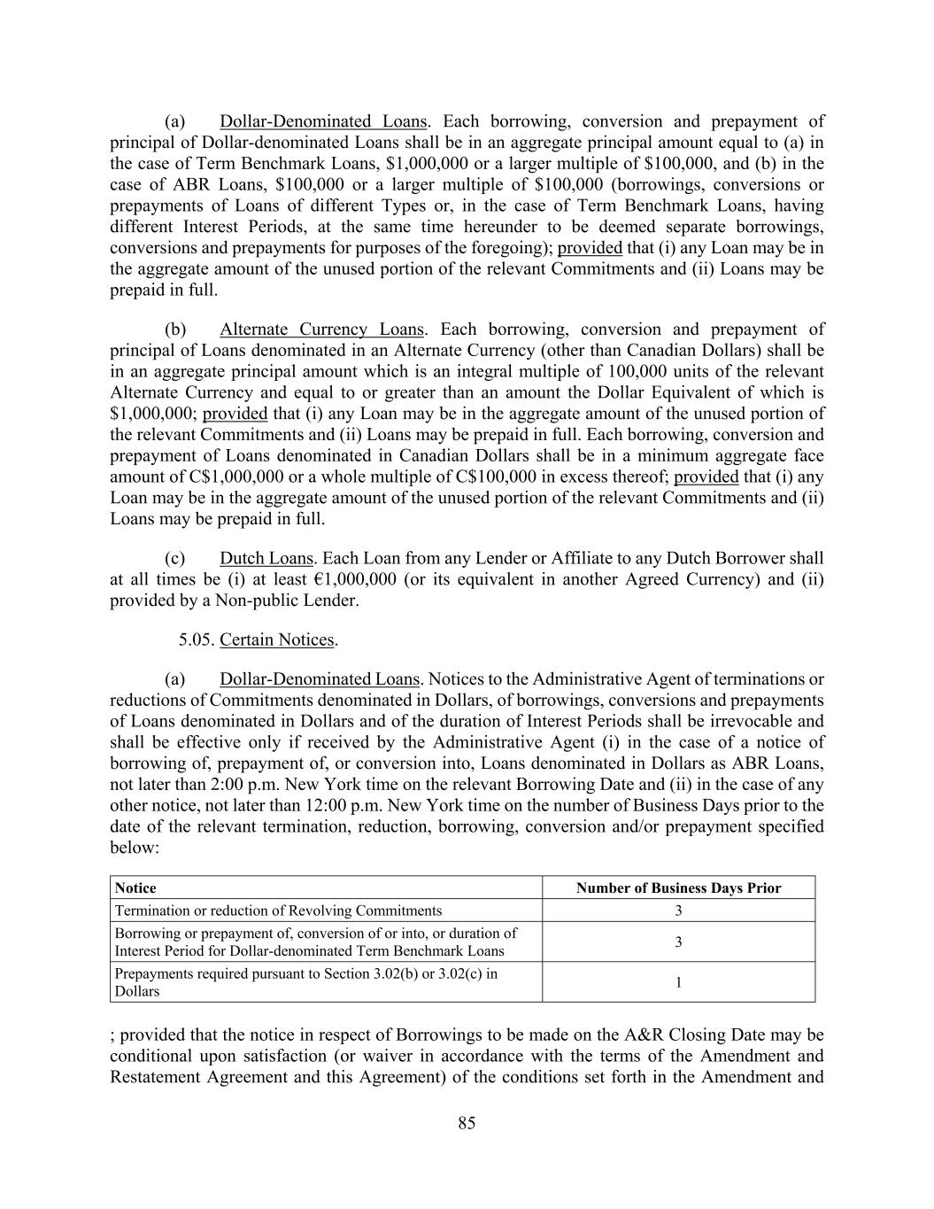 85(a)美元计价贷款。美元计价贷款的每笔借款、转换和提前偿还本金的本金总额应等于(a)定期基准贷款为1000000美元或100000美元的较大倍数,(b)ABR贷款为100000美元或100000美元的较大倍数(不同类型贷款的借款、转换或提前偿还,或定期基准贷款为不同计息期的贷款,同时在本协议项下视为单独借款,为上述目的的转换和预付款);但(i)任何贷款的总额可能是相关承诺未使用部分的总额,以及(ii)贷款可以全额预付。(b)替代货币贷款。以替代货币(加元除外)计价的贷款的每笔借款、转换和提前偿还本金,本金总额应为相关替代货币的100,000单位的整数倍,并等于或大于相当于1,000,000美元的金额;但前提是(i)任何贷款可能为相关承诺未使用部分的总额,以及(ii)贷款可全额预付。以加元计价的每笔借款、转换和提前偿还贷款的最低总面值应为1,000,000加元或超过100,000加元的整倍;但前提是(i)任何贷款的总额可能是相关承诺未使用部分的总额,以及(ii)贷款可以全额预付。(c)荷兰贷款。任何贷款人或附属机构向任何荷兰借款人提供的每笔贷款,在任何时候都应(i)至少为1,000,000欧元(或其等值的另一种约定货币),以及(ii)由非公共贷款人提供。5.05.某些通知。(a)美元计价贷款。向行政代理人发出的终止或减少以美元计值的承诺、以美元计值的借款、转换和提前偿还贷款以及利息期限的通知,应是不可撤销的,并且只有在行政代理人(i)收到以美元计值的贷款作为ABR贷款的借款、提前偿还或转换为贷款的通知时,才有效,不迟于相关借款日期的纽约时间下午2:00,以及(ii)在收到任何其他通知的情况下,不迟于纽约时间下午12时以下列明的相关终止、减少、借款、转换和/或提前还款日期前的营业天数:通知终止或减少循环承诺前的营业天数3借款或提前还款、转换或转入,或以美元计价的定期基准贷款的利息期持续时间3根据第3.02(b)或3.02(c)节要求的以美元1计的预付款项;但有关将在A & R截止日期作出的借款的通知可能以满足(或根据修订和重述协议和本协议的条款放弃)修订和