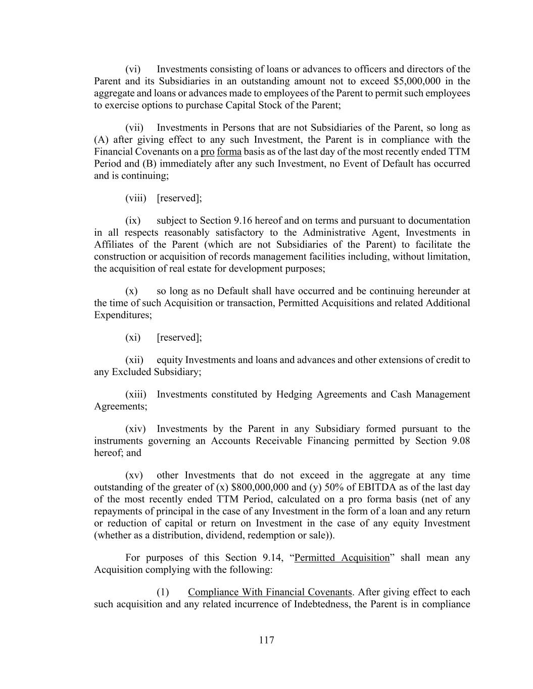 117(vi)投资,包括向母公司及其子公司的高级管理人员和董事提供总额不超过5,000,000美元的贷款或垫款,以及向母公司员工提供的贷款或垫款,以允许这些员工行使购买母公司股本的选择权;(vii)向非母公司子公司的人员进行的投资,只要(a)在任何此类投资生效后,截至最近结束的TTM期间的最后一天,母公司在备考基础上遵守财务契约,并且(b)在紧接任何该等投资后,并无任何违约事件发生且仍在继续;(viii)[保留];(ix)根据本协议第9.16条以及根据行政代理人合理满意的条款和根据所有方面的文件,向母公司的附属公司(不是母公司的附属公司)进行投资,以便利建设或购置记录管理设施,包括但不限于,为开发目的收购房地产;(x)只要在该收购或交易发生时未发生违约且仍在继续,允许的收购和相关的额外支出;(xi)[保留];(xii)股权投资以及向任何被排除在外的子公司提供贷款和垫款以及其他信贷展期;(xiii)由套期保值协议和现金管理协议构成的投资;(xiv)母公司对根据本协议第9.08条允许的应收账款融资管理工具成立的任何子公司的投资;(xv)在任何时候未偿还的总额不超过(x)800,000,000美元和(y)截至最近一期结束的最后一天EBITDA的50%(以较高者为准)的其他投资,按备考基准计算(扣除以贷款形式进行的任何投资的任何本金偿还以及任何股权投资(无论是作为分配、股息、赎回或出售)的任何资本回报或减少或投资回报)。就本第9.14条而言,“许可收购”系指符合以下规定的任何收购:(1)遵守财务契约。在每项该等收购及任何相关债务产生生效后,母公司合规