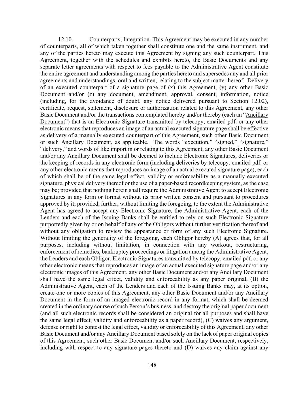 148 12.10.对口单位;一体化。本协议可以在任意数量的对应方中执行,所有这些对应方加在一起构成同一文书,本协议任何一方可以通过签署任何此类对应方来执行本协议。本协议连同本协议的附表和证物、基本文件以及与应付给行政代理人的费用有关的任何单独的信函协议构成本协议各方之间的全部协议和谅解,并取代与本协议标的有关的任何和所有先前的口头和书面协议和谅解。交付(x)本协议签署页、(y)任何其他基本文件和/或(z)任何文件、修订、批准、同意、资料、通知(为免生疑问,包括根据第12.02条交付的任何通知)、与本协议有关的证书、请求、声明、披露或授权、任何其他基本文件和/或在此设想的交易和/或由此设想的交易(每一项均为“附属文件”),该交易为通过电传的电子签名,通过电子邮件发送的pdf.或任何其他电子手段复制实际执行的签名页的图像,应作为交付本协议的手动执行对应方、适用的其他基本文件或辅助文件有效。“执行”、“签署”、“签署”、“交付”等字样与本协议中或与本协议有关的类似进口字样、任何其他基本文件和/或任何附属文件应被视为包括电子签字、交付或以任何电子形式保存记录(包括通过电传、电子邮件pdf或任何其他复制实际已执行签字页图像的电子方式交付),每一项均应具有与人工签署的签字、其实物交付或使用纸质记录保存系统相同的法律效力、有效性或可执行性,视情况而定;但本文中的任何规定均不得要求行政代理人未经其事先书面同意并按照其批准的程序接受任何形式或格式的电子签字;此外,在不限制前述规定的情况下,在行政代理人同意接受任何电子签字的范围内,行政代理人,各放款人及各开证银行均有权依赖声称由任何义务人或代表任何义务人提供的该等电子签名,而无须进一步核实,亦无任何义务审查任何该等电子签名的外观或形式。在不限制前述内容的一般性的情况下,各义务人在此(a)同意,为所有目的,包括但不限于与行政代理人、贷款人和各义务人之间的任何解决、重组、强制执行补救措施、破产程序或诉讼有关,通过电传、电子邮件pdf传送的电子签名或任何其他电子方式复制实际已执行的签名页的图像和/或本协议的任何电子图像,任何其他基本文件和/或任何附属文件应具有与任何纸质原件相同的法律效力、有效性和可执行性,(b)行政代理人,各出借人及各开证行可自行选择以任何格式的影像电子记录形式创建一份或多份本协议、任何其他基本文件和/或任何附属文件,这些文件应被视为在该人的正常业务过程中创建,并销毁原始纸质文件(所有此类电子记录应被视为所有目的的原件,并应与纸质记录具有相同的法律效力、有效性和可执行性),(c)放弃任何争论、抗辩或对法律效力提出异议的权利,本协议、任何其他基本文件和/或任何附属文件的有效性或可执行性仅基于本协议、该等其他基本文件和/或该等附属文件分别缺乏纸质正本副本,包括就其任何签字页和(d)放弃对任何