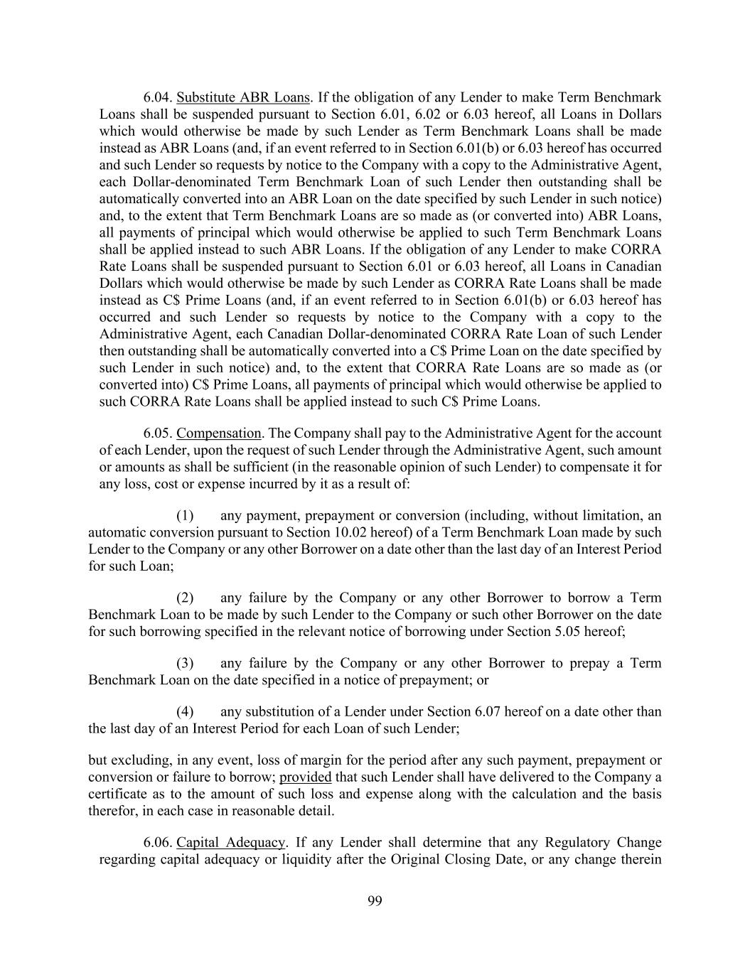 99 6.04.替代ABR贷款。如任何贷款人根据本协议第6.01、6.02或6.03节暂停提供定期基准贷款的义务,则该贷款人本应作为定期基准贷款提供的所有美元贷款应改为ABR贷款(并且,如果本协议第6.01(b)或6.03节中提及的事件已经发生,而该贷款人通过向公司发出通知并向行政代理人提供一份副本而如此要求,该贷款人当时未偿还的每笔以美元计价的定期基准贷款应在该贷款人在该通知中指定的日期自动转换为ABR贷款),并且,在定期基准贷款作为(或转换为)ABR贷款的范围内,本应适用于该定期基准贷款的所有本金付款应改为适用于该ABR贷款。如任何贷款人根据本协议第6.01或6.03节暂停提供CORRA利率贷款的义务,则本应由作为CORRA利率贷款的该贷款人提供的所有加元贷款应改为加元优惠贷款(并且,如果本协议第6.01(b)或6.03节中提及的事件已经发生,而该贷款人通过向公司发出通知并向行政代理人提供一份副本的方式如此要求,该贷款人当时未偿还的每笔以加元计价的CORRA利率贷款应在该贷款人在该通知中指定的日期自动转换为加元优惠贷款),并且,在CORRA利率贷款作为(或转换为)加元优惠贷款的范围内,否则将适用于该CORRA利率贷款的所有本金付款应适用于该等加元优惠贷款。6.05.赔偿。公司须应每名贷款人透过行政代理人提出的要求,向该行政代理人支付足以(该贷款人合理认为)补偿其因以下情况而招致的任何损失、成本或开支的款额(1)任何付款、预付或转换(包括但不限于,根据本条例第10.02条自动转换)该贷款人在该贷款的利息期最后一天以外的日期向公司或任何其他借款人作出的定期基准贷款;(2)公司或任何其他借款人未能在该日期向该贷款人向公司或该其他借款人作出的定期基准贷款借款就根据本条例第5.05条作出的有关借款通知书所指明的该等借款;(3)公司或任何其他借款人未能在提前还款通知书所指明的日期预付定期基准贷款;或(4)根据本条例第6.07条作出的任何替代贷款人的日期,而该等贷款人的每笔贷款的利息期最后一天除外;但无论如何不包括在任何该等付款后的期间的保证金损失,提前还款或转换或未能借款;但该贷款人应已向公司交付关于此类损失和费用的金额以及计算及其依据的证明,在每种情况下均应提供合理详细的证明。6.06.资本充足。如任何贷款人须确定在原截止日期后有关资本充足率或流动性的任何监管变动,或其中的任何变动