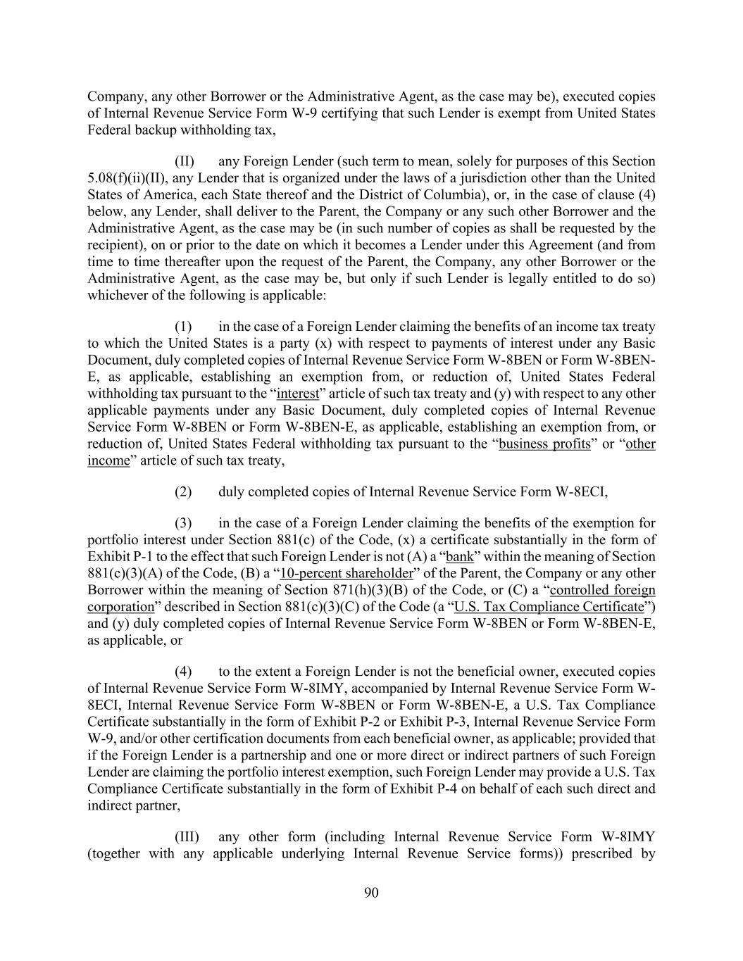 90公司、任何其他借款人或行政代理人(视属何情况而定)签立的美国国税局W-9表格副本,证明该贷款人豁免美国联邦备用预扣税,(II)任何外国贷款人(该术语仅为本条5.08(f)(ii)(II)的目的是指根据美利坚合众国、其每个州和哥伦比亚特区以外的司法管辖区的法律组建的任何贷款人),或在以下第(4)条的情况下,任何贷款人,应向母公司交付,公司或任何该等其他借款人及行政代理人(视属何情况而定)在其根据本协议成为贷款人之日或之前(及其后不时应母公司、公司、任何其他借款人或行政代理人(视属何情况而定)的要求,但前提是该贷款人在法律上有权这样做)以下任一情况均适用:(1)在外国贷款人就任何基本文件下的利息支付主张美国作为缔约方的所得税条约(x)的好处的情况下,妥为填写的美国国税局W-8BEN表格或W-8BEN-E表格(如适用)副本,确定豁免或减少,美国联邦预扣税根据此类税收协定的“利息”条款和(y)就任何基本文件下的任何其他适用付款,适当填写的美国国税局W-8BEN表格或W-8BEN-E表格(如适用)副本,确立根据此类税收协定的“商业利润”或“其他收入”条款豁免或减少美国联邦预扣税,(2)适当填写的美国国税局W-8ECI表格副本,(3)如果外国贷款人根据《守则》第881(c)条要求投资组合利息豁免的好处,(x)一份大意为附件 P-1形式的证明,证明该外国贷款人不是(a)《守则》第881(c)(3)(a)条所指的“银行”,(b)《守则》第871(h)(3)(b)条所指的母公司、公司或任何其他借款人的“10%股东”,或(c)《守则》第881(c)(3)(c)条所述的“受控外国公司”(“美国税务合规证书”),以及(y)妥为填妥的美国国税局W-8BEN表格或W-8BEN-E表格(如适用)的副本,或(4)在外国贷款人不是受益所有人的情况下,签立美国国税局W-8IMY表格的副本,并附有美国国税局W-8ECI表格、美国国税局W-8BEN表格或W-8BEN-E表格、基本上以附件附件 P-2或TERM3、美国国税局W-9表格和/或每个受益所有人提供的其他证明文件(如适用)形式的美国税务合规证书;但前提是,如果外国贷款人是合伙企业,且该外国贷款人的一个或多个直接或间接合伙人正在主张投资组合利息豁免,该等外国贷款人可代表每一该等直接和间接合作伙伴提供基本上以附件-04形式的美国税务合规证书,(iii)任何其他表格(包括美国国税局W-8IMY表格(连同任何适用的基础美国国税局表格))由