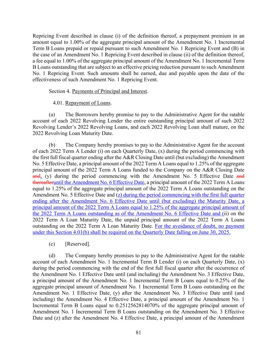 81其定义第(i)款所述的重新定价事件、金额相当于根据该第1号修订重新定价事件预付或偿还的第1号修订增量期限B贷款本金总额的1.00%的提前还款溢价以及(b)在其定义第(ii)款所述的第1号修订重新定价事件的情况下,根据该第1号修订重新定价事件,受有效定价下调影响的未偿还的第1号修订增量B期贷款本金总额的1.00%的费用。该等金额应于该修订第1号重定价事件生效之日赚取、到期及应付。第4节。本金和利息的支付。4.01.偿还贷款。(a)借款人在此承诺,于2022年循环贷款到期日向各2022年循环贷款人的应课税账户的行政代理人支付该2022年循环贷款人的2022年循环贷款的全部未偿本金,且每笔2022年循环贷款均应到期。(b)公司谨此承诺,在每个季度日期,(x)在自A & R结束日期后的第一个完整财政季度开始直至(但不包括)第5号修订生效日期的期间内,向行政代理人支付2022年A期贷款的本金,金额相当于在A & R结束日期向公司提供资金的2022年A期贷款本金总额的1.25%,以及,(y)在自第5号修订生效日期开始及其后直至第6号修订生效日期的期间内,2022年A期贷款的本金金额相当于在第5号修订生效日期未偿还的2022年A期贷款本金总额的1.25%,以及(z)在自第6号修订生效日期后的第一个完整季度开始直至(但不包括)到期日的期间内,2022年A期贷款的本金金额,相当于截至第6号修正案生效日期的2022年A期贷款未偿还本金总额的1.25%,以及(ii)在2022年A期贷款到期日,2022年A期贷款到期日未偿还的2022年A期贷款的未偿还本金金额。为免生疑问,于2025年6月30日的季度日期,无须根据本条第4.01(b)条缴付款项。(c)[保留]。(d)公司谨此承诺,于每个季度日期,(x)自第1号修订生效日期发生后的第一个完整财政季度末开始直至(包括)第3号修订生效日期的期间内,向行政代理人支付每项修订第1号增量B期贷款的应课税账户本金,金额相当于第1号修订生效日期未偿还的第1号增量B期贷款本金总额的0.25%,(y)在第3号修订生效日期后直至(并包括)第4号修订生效日期,第1号修订增量期B贷款的本金金额相当于在第3号修订生效日期未偿还的第1号修订增量期B贷款本金总额的0.25 12562814070%,以及(z)在第4号修订生效日期后,修订的本金金额