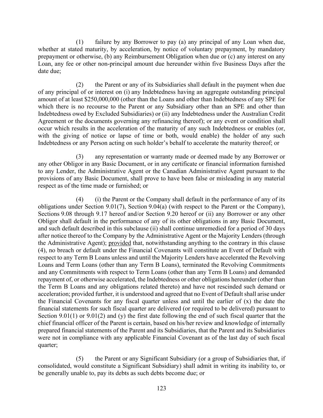 123(1)任何借款人未能支付(a)任何贷款到期时的任何本金,不论是在规定的到期日、通过加速、通过自愿提前还款通知、通过强制提前还款或其他方式,(b)到期时的任何偿还义务或(c)任何贷款的任何利息,在到期日期后五个营业日内根据本协议到期的任何费用或其他非本金金额;(2)母公司或其任何子公司在(i)任何未偿本金总额至少为250,000,000美元的债务的任何本金或利息到期时,应拖欠付款(任何SPE的贷款和债务除外,但对母公司或SPE以外的任何子公司没有追索权的债务除外除被排除在外的附属公司所欠的债务)或(ii)根据澳大利亚信贷协议或其任何再融资文件所欠的任何债务);或发生任何事件或条件,导致任何该等债务加速到期,或使(或随着发出通知或时间推移或两者兼而有之,将使)任何该等债务的持有人或代表该持有人行事的任何人加速到期;或(3)任何借款人或任何其他义务人在任何基本文件中作出或视为作出的任何陈述或保证,或在根据任何基本文件的规定向任何贷款人、行政代理人或加拿大行政代理人提供的任何证明或财务资料中,应证明截至作出或提供时在任何重大方面是虚假或具有误导性的;或(4)(i)母公司或公司在履行其根据第9.01(7)条、第9.04(a)条(就母公司或公司而言)承担的任何义务时出现违约,本条例第9.08至9.17条及/或本条例第9.20条或(ii)任何借款人或任何其他债务人在履行其在任何基本文件中的任何其他义务时均有失责,而本第(ii)款所述的失责须在行政代理人或多数贷款人(透过行政代理人)向公司发出有关通知后的30天内继续无补救;但即使本条第(4)款另有相反规定,除非且直至多数贷款人加速循环贷款及定期贷款(任何B期贷款除外)、终止循环承诺及与定期贷款(任何B期贷款除外)有关的任何承诺并要求偿还或以其他方式加速偿还本协议项下的债务或其他义务(B期贷款及其相关的任何义务除外)且尚未撤销该等要求或加速事项,否则财务契约项下的任何违约或违约将构成任何B期贷款的违约事件;此外,据了解并同意,根据财务契约,任何财政季度均不得发生违约事件,除非且直至(x)根据第9.01(1)或9.01(2)节交付(或要求交付)该财政季度财务报表之日(以较早者为准),以及(y)母公司首席财务官根据其对母公司及其子公司内部编制的财务报表的审查和了解情况确定的该财政季度结束后的第一个日期,截至该财政季度最后一天,母公司及其子公司未遵守任何适用的财务契约;(5)母公司或任何重要子公司(或一组子公司,如果合并,将构成重要子公司)应书面承认其无力或一般无法在债务到期时支付其债务;或