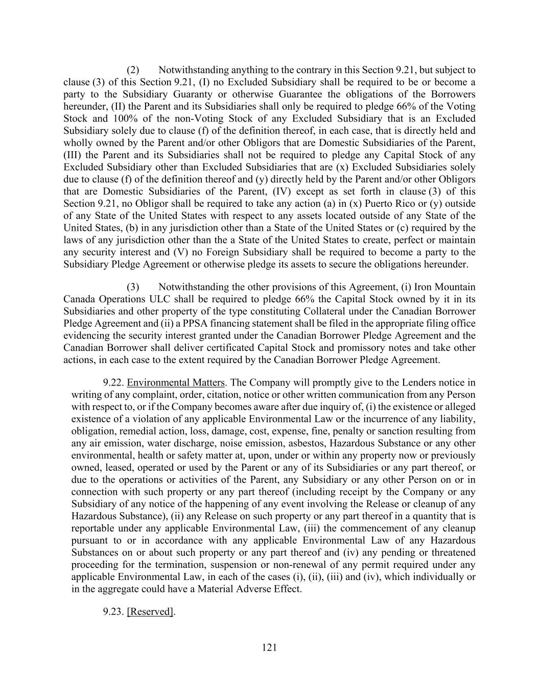 121(2)尽管本条第9.21条另有相反规定,但在符合本条第9.21条第(3)款的规定下,(i)任何被排除的附属公司不得被要求成为或成为附属公司担保的一方或以其他方式为借款人在本协议项下的义务提供担保,(ii)母公司及其附属公司仅应被要求质押任何被排除的附属公司的66%的有表决权股份和100%的无表决权股份,而该附属公司是仅因其定义的(f)条而被排除的附属公司,在每种情况下,由母公司和/或其他属于母公司境内子公司的义务人直接持有和全资拥有的,(III)母公司及其子公司不得被要求质押除属于(x)被排除子公司以外的任何被排除子公司的任何股本,这些子公司仅因其定义的(f)条和(y)由母公司和/或属于母公司境内子公司的其他义务人直接持有,(IV)除非本第9.21条第(3)款规定,任何义务人不得被要求(a)在(x)波多黎各或(y)美国任何州以外就位于美国任何州以外的任何资产采取任何行动,(b)在美国一州以外的任何司法管辖区或(c)美国一州以外的任何司法管辖区的法律要求设立,完善或维持任何担保权益及(v)不得要求任何外国附属公司成为附属质押协议的一方或以其他方式质押其资产以担保本协议项下的义务。(3)尽管有本协议的其他规定,(i)铁山加拿大业务ULC应被要求将其在其子公司拥有的66%的股本以及根据加拿大借款人质押协议构成抵押品类型的其他财产进行质押,以及(ii)PPSA融资报表应在适当的备案处备案,以证明根据加拿大借款人质押协议授予的担保权益,并且加拿大借款人应交付凭证式股本和本票并采取其他行动,在每种情况下均以加拿大借款人质押协议要求的范围为限。9.22.环境问题。公司将迅速向贷款人发出书面通知,告知任何人就以下事项提出的任何投诉、命令、引证、通知或其他书面通讯,或如公司在适当查询后知悉,(i)存在或指称存在违反任何适用环境法的情况,或因任何空气排放、水排放、噪音排放、石棉、有害物质或任何其他环境、健康或安全事项而产生的任何责任、义务、补救行动、损失、损害、成本、费用、罚款、处罚或制裁,于,在母公司或其任何子公司或其任何部分现在或以前拥有、租赁、经营或使用的任何财产下或在其内,或由于母公司、任何子公司或任何其他人在该财产或其任何部分上或与其有关的经营或活动(包括公司或任何子公司收到任何涉及释放或清理任何有害物质的事件发生的通知),(ii)该财产或其任何部分上的任何释放,其数量根据任何适用的环境法应予报告,(iii)依据或依据任何适用的环境法开始对该财产或其任何部分上或周围的任何有害物质进行任何清理,以及(iv)在(i)、(ii)、(iii)及(iv)每一情况下为终止、暂停或不延续任何适用的环境法所要求的任何许可证而进行的任何待决或威胁的程序,而这些程序个别或合计可能产生重大不利影响。9.23.[保留]。