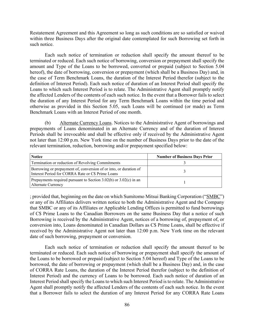 86重述协议和本协议,只要该等条件在该通知中规定的此类借款的原定日期后三个营业日内如此满足或被放弃。每份该等终止或减少通知书须指明终止或减少的金额。每份此类借款、转换或提前还款通知应具体说明拟借款、转换或预付的贷款的金额和类型(以本协议第5.04条为准),借款、转换或提前还款的日期(应为一个营业日),如为定期基准贷款,则应说明相关利息期的持续时间(以利息期的定义为准)。每份有关利息期存续期的上述通知均应指明该利息期所涉及的贷款。行政代理人应当将每一份此类通知的内容及时通知受影响的出借人。如果借款人未能按照本条第5.05款的规定在该期限内或其他情况下为任何定期基准贷款选择任何利息期的期限,则此种贷款将作为利息期为一个月的定期基准贷款继续(或发放)。(b)替代货币贷款。向行政代理人发出的关于以替代货币计值的借款和提前偿还贷款以及利息期持续时间的通知是不可撤销的,并且只有在行政代理人不迟于纽约时间下午12:00收到有关终止、减少、借款和/或提前偿还日期的前几个工作日的通知时才有效:通知终止或减少循环承诺前的营业天数3借款或提前偿还、转换或成,或CORRA Rate或C $ Prime Loans的利息期持续时间3根据第3.02(b)或3.02(c)节要求以替代货币1支付的预付款;但前提是,自三井住友银行(“SMBC”)或其任何关联公司向行政代理人和公司双方送达书面通知之日起,在行政代理人收到此类借款通知的同一工作日,允许SMBC或其任何关联公司或适用的贷款办公室为向加拿大借款人的C $ Prime Loans借款提供资金之日起,以加元计价的贷款作为加元Prime贷款的借款、提前还款或转换为贷款的通知,如行政代理人不迟于此类借款、提前还款或转换的相关日期纽约时间下午12:00收到,则应生效。每份该等终止或减少通知书须指明终止或减少的金额。每份此类借款或提前还款通知应具体说明拟借款或预付的贷款金额(受本协议第5.04条的约束)和拟借款的类型、借款或提前还款的日期(应为营业日),如为CORRA利率贷款,则应说明相关的利息期期限(受利息期定义的约束)和拟借款的币种。每份有关利息期存续期的上述通知均应指明该利息期所涉及的贷款。行政代理人应当将每一份此类通知的内容及时通知受影响的出借人。如果借款人未能为任何CORRA利率贷款选择任何利息期的期限