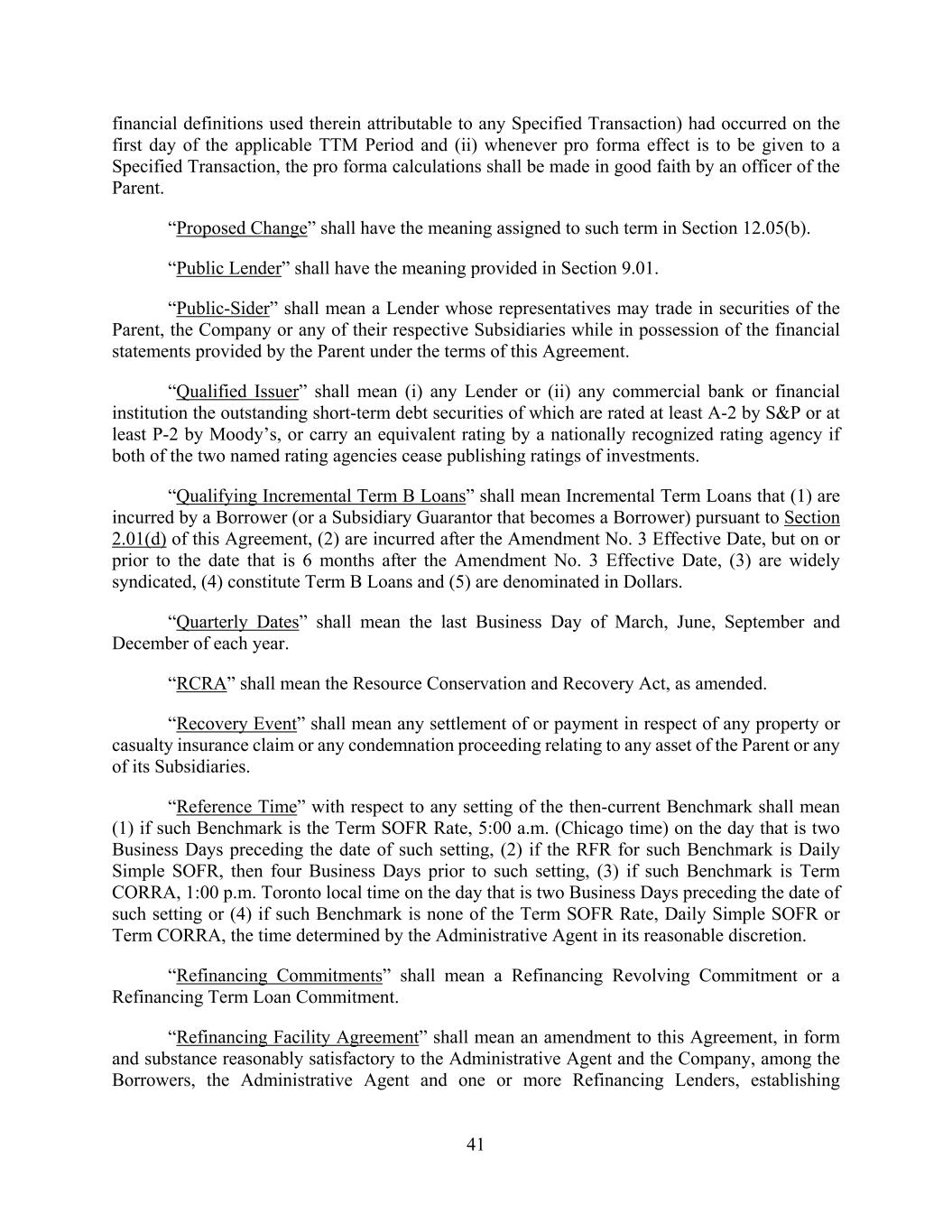 其中使用的可归属于任何特定交易的41项财务定义)已发生在适用的TTM期间的第一天,并且(ii)每当对特定交易给予备考影响时,备考计算应由母公司的一名高级职员本着诚意进行。“提议的变更”应具有第12.05(b)节中赋予该术语的含义。“公共贷款人”应具有第9.01条规定的含义。“Public-Sider”是指贷款人,其代表可以在拥有母公司根据本协议条款提供的财务报表的情况下交易母公司、公司或其各自的任何子公司的证券。“合格发行人”是指(i)任何贷款人或(ii)任何商业银行或金融机构的未偿短期债务证券被标普评级至少为A-2或被穆迪评级至少为P-2,或在两个指定的评级机构均停止发布投资评级的情况下由国家认可的评级机构进行同等评级。“合格增量B期贷款”是指(1)由借款人(或成为借款人的附属担保人)根据本协议第2.01(d)节发生,(2)在第3号修正案生效日期之后发生,但在第3号修正案生效日期后6个月或之前发生的增量定期贷款,(3)广泛银团,(4)构成B期贷款,(5)以美元计价。“季度日”是指每年3月、6月、9月、12月的最后一个营业日。“RCRA”是指经修订的《资源保护和恢复法》。“追偿事件”是指与母公司或其任何子公司的任何资产有关的任何财产或意外伤害保险索赔或任何谴责程序的任何和解或付款。就当时的现行基准的任何设定而言,“参考时间”系指(1)如果该基准是期限SOFR利率,则在该设定日期前两个工作日的当天上午5:00(芝加哥时间),(2)如果该基准的RFR是Daily Simple SOFR,则在该设定前四个工作日,(3)如果该基准是期限CORRA,则在该设定日期前两个工作日的当天下午1:00多伦多当地时间,或(4)如果该基准不是期限SOFR利率,每日简单SOFR或术语CORRA,由行政代理人在其合理酌情权下确定的时间。“再融资承诺”是指再融资循环承诺或再融资定期贷款承诺。“再融资便利协议”系指借款人、行政代理人和一名或多名再融资出借人之间对本协议在形式和实质上均合理地令行政代理人和公司满意、确立
